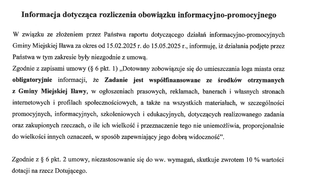 Poniżej znajduje się kwota, jaką musi oddać ten klub, oraz numer konta na jaki należy przesłać pieniądze. Mamy dwa takie pisma z UM Iława przesłane do klubów, różnią się tylko kwotą do oddania, można więc zakładać, że najważniejsza część tekstu jest taka sama dla wszystkich „ukaranych”.