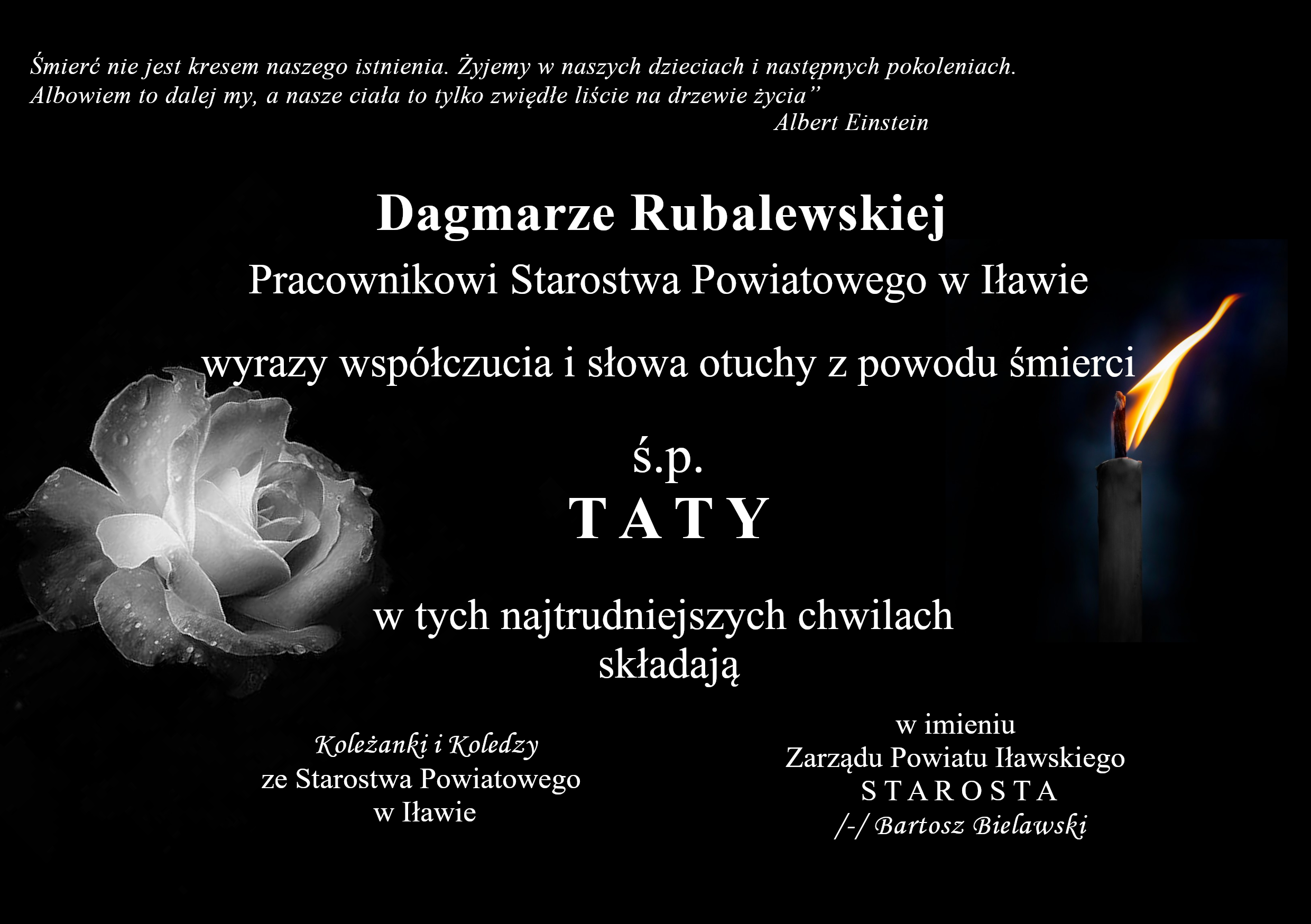 Pani Dagmarze Rubalewskiej wyrazy współczucia i słowa otuchy z powodu śmierci śp. Taty w tych najtrudniejszych chwilach składają Koleżanki i Koledzy ze Starostwa Powiatowego w Iławie oraz w imieniu Zarządu Powiatu Iławskiego Starosta Bartosz Bielawski.