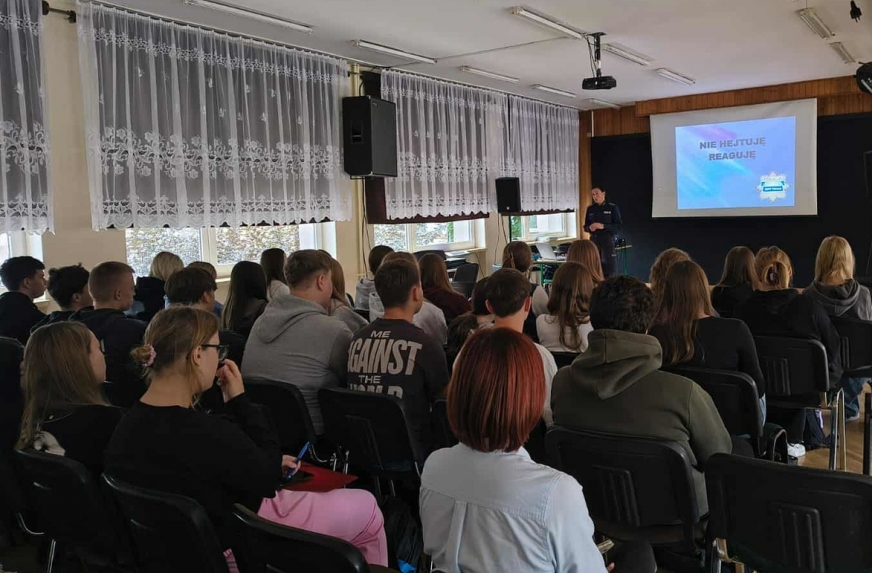 "Nie hejtuję - reaguję". Spotkanie policjantek z młodzieżą iławskiego "Mechanika". (Fot. KPP w Iławie.)