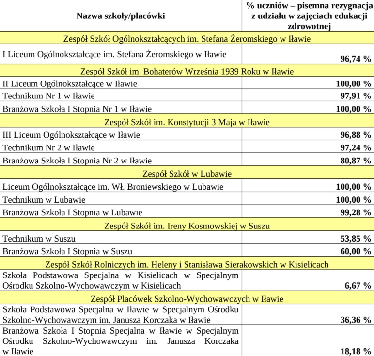 Starostwo Powiatowe w Iławie - podobnie jak wcześniej Iławskie Centrum Usług Wspólnych – udostępniło portalowi www.infoilawa.pl dokładne dane na temat odsetka uczniów, dla których złożono pisemne rezygnacje z zajęć edukacji zdrowotnej. Z liczb płynie prosty wniosek – przytłaczająca większość uczniów lokalnych szkół średnich nie będzie uczęszczać na nowy przedmiot.