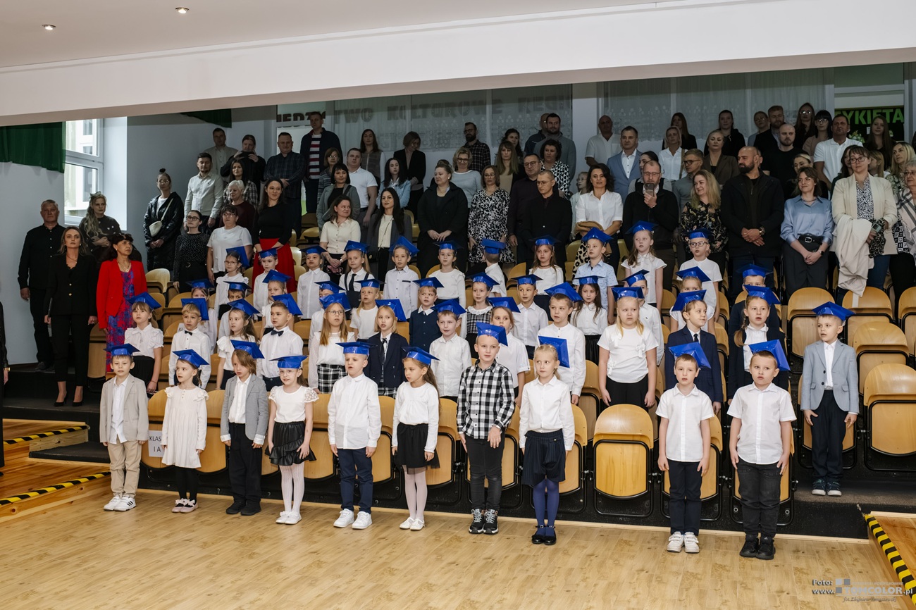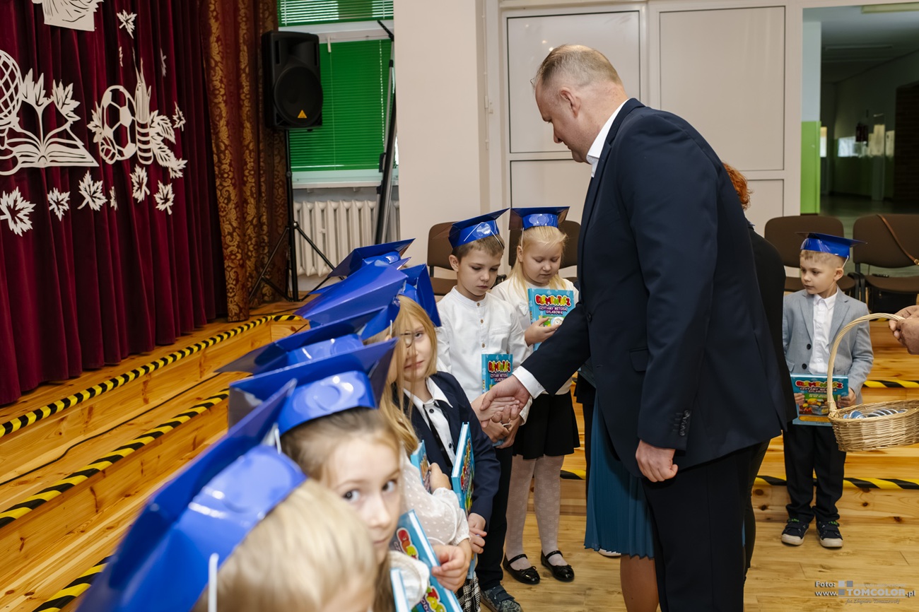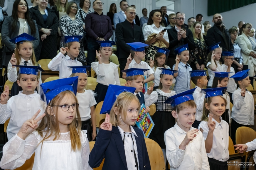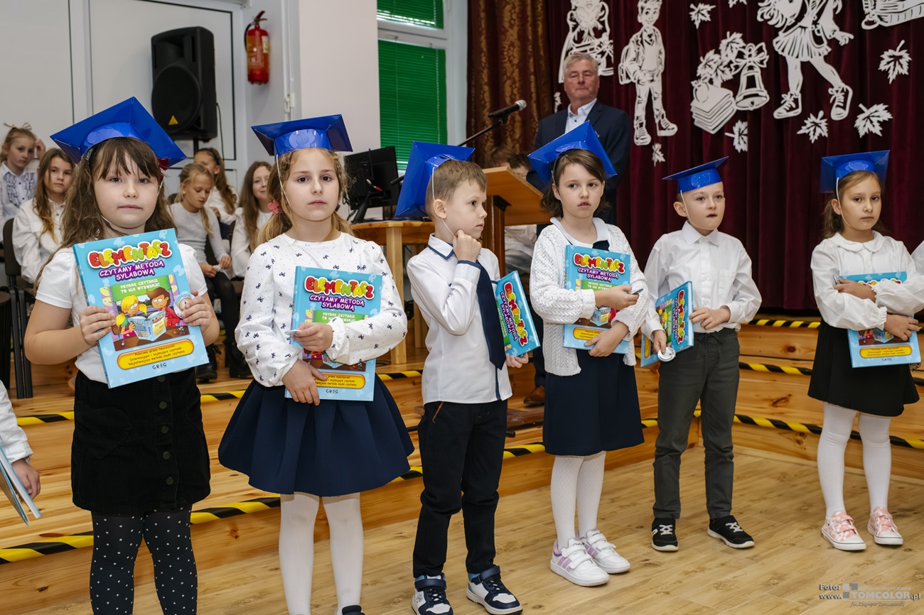 Miłym akcentem było wręczenie każdemu pierwszoklasiście książki do nauki czytania, ufundowanej przez Radę Rodziców. Ten symboliczny prezent ma zachęcać dzieci do rozwijania pasji czytelniczej i odkrywania świata poprzez książki. Zebranych urzekła nie tylko recytacja „Katechizmu polskiego dziecka” - znanego wiersza autorstwa Władysława Bełzy oraz śpiew piosenek zaprezentowany przez uczniów klas pierwszych, ale przede wszystkim odśpiewanie przez dzieci z pamięci czterech zwrotek „Mazurka Dąbrowskiego”. Wyrazem uznania były gromkie i gorące oklaski ze strony widowni. W czasie uroczystości nie zabrakło także starszych kolegów – uczniowie klas czwartych przygotowali ciepłe powitanie i uroczyście przyjęli pierwszoklasistów do grona społeczności szkolnej.