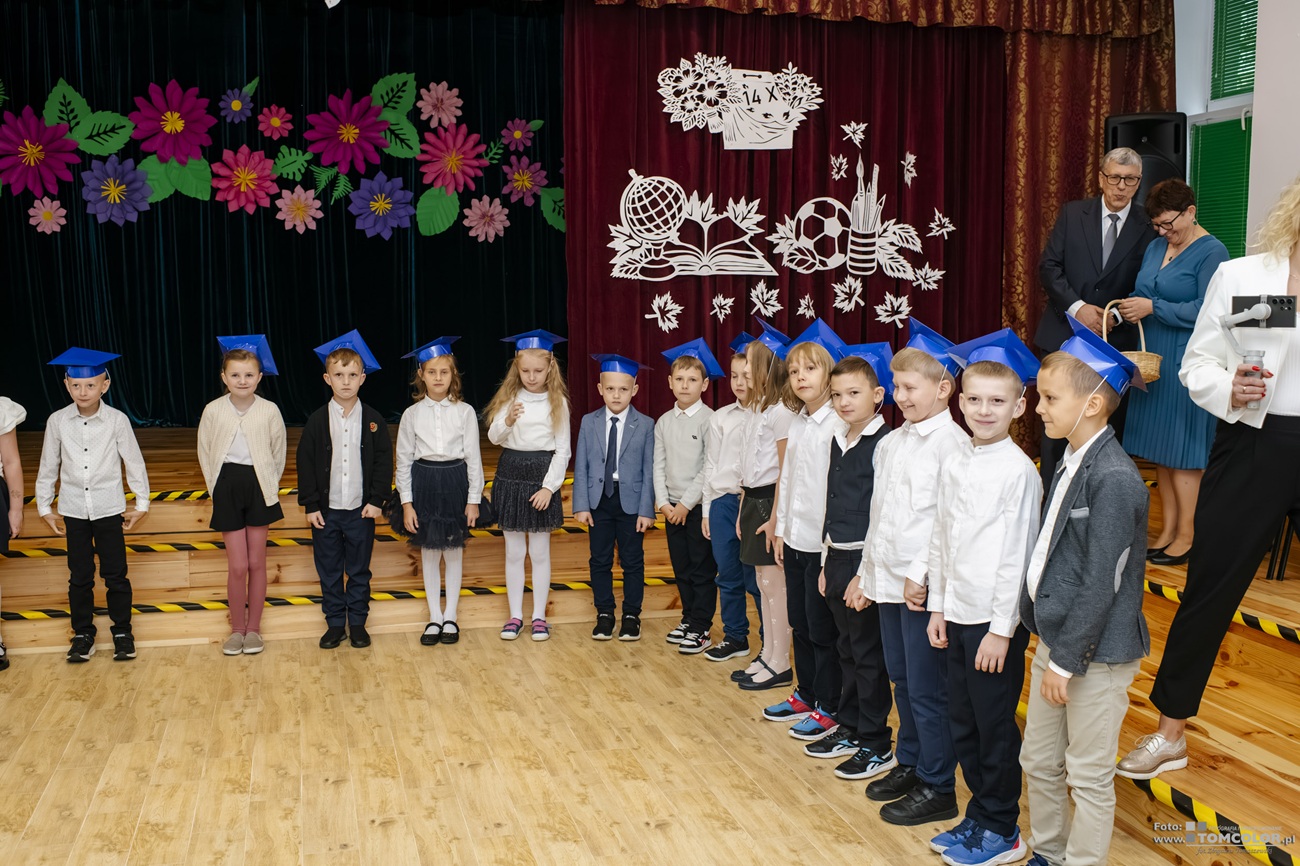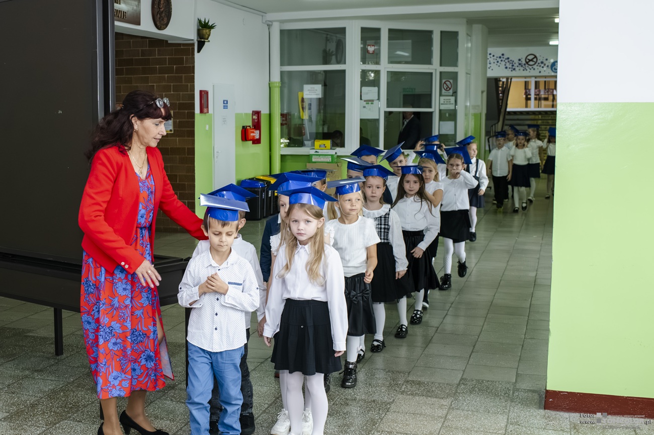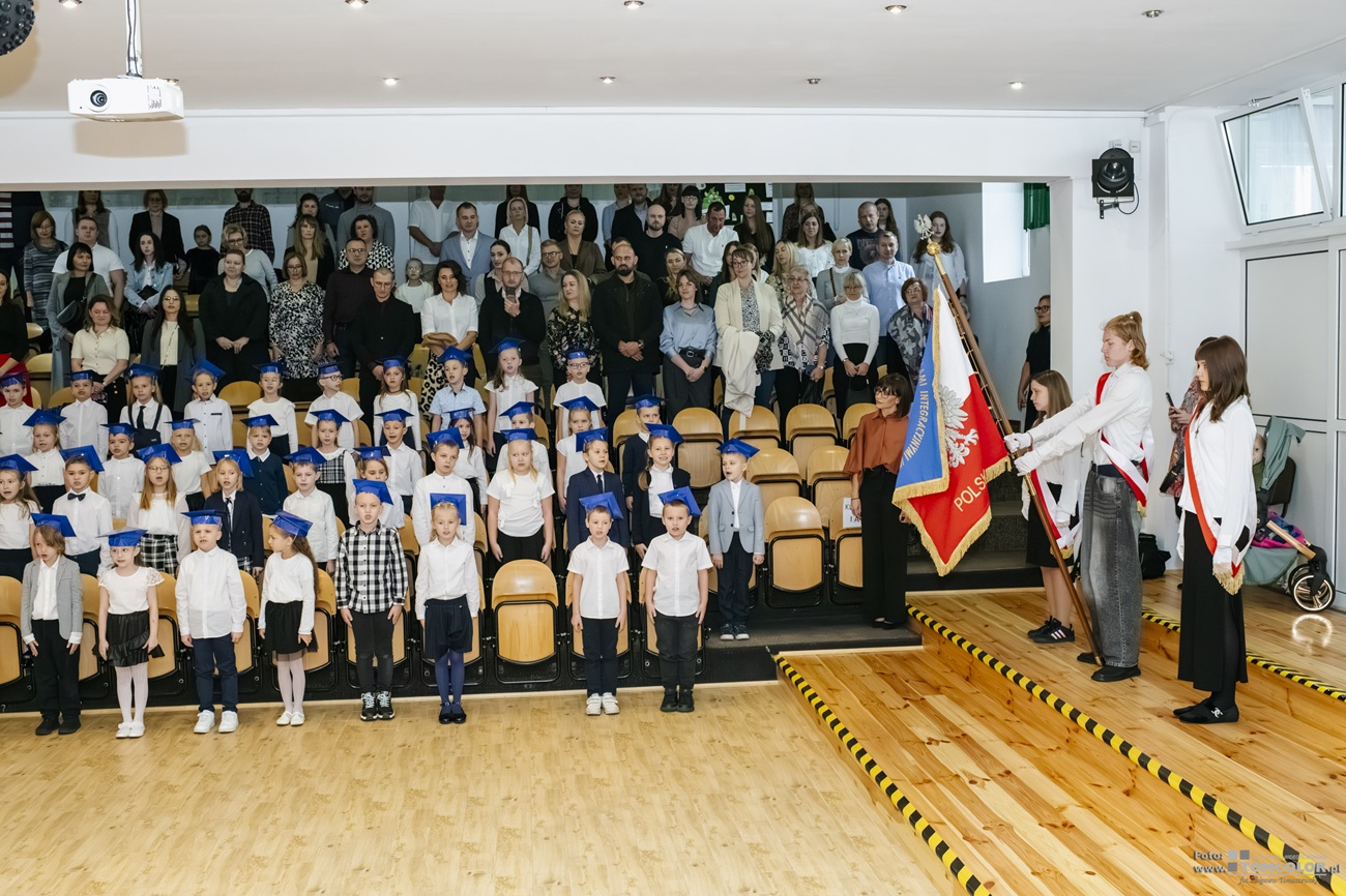 Miłym akcentem było wręczenie każdemu pierwszoklasiście książki do nauki czytania, ufundowanej przez Radę Rodziców. Ten symboliczny prezent ma zachęcać dzieci do rozwijania pasji czytelniczej i odkrywania świata poprzez książki. Zebranych urzekła nie tylko recytacja „Katechizmu polskiego dziecka” - znanego wiersza autorstwa Władysława Bełzy oraz śpiew piosenek zaprezentowany przez uczniów klas pierwszych, ale przede wszystkim odśpiewanie przez dzieci z pamięci czterech zwrotek „Mazurka Dąbrowskiego”. Wyrazem uznania były gromkie i gorące oklaski ze strony widowni. W czasie uroczystości nie zabrakło także starszych kolegów – uczniowie klas czwartych przygotowali ciepłe powitanie i uroczyście przyjęli pierwszoklasistów do grona społeczności szkolnej.