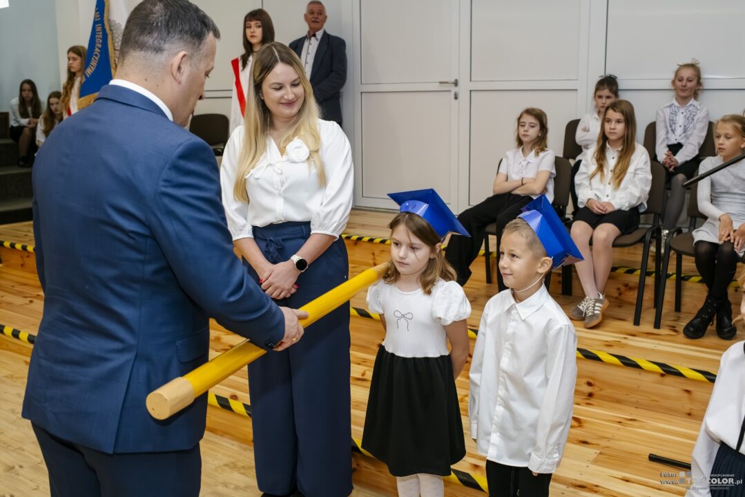Dzieci w galowych strojach złożyły uroczyste ślubowanie na sztandar szkoły, przyrzekając sumiennie się uczyć, być dobrymi kolegami i godnie reprezentować swoją szkołę. Następnie Pan Dyrektor – Mariusz Sadowski – dokonał symbolicznego aktu pasowania na ucznia