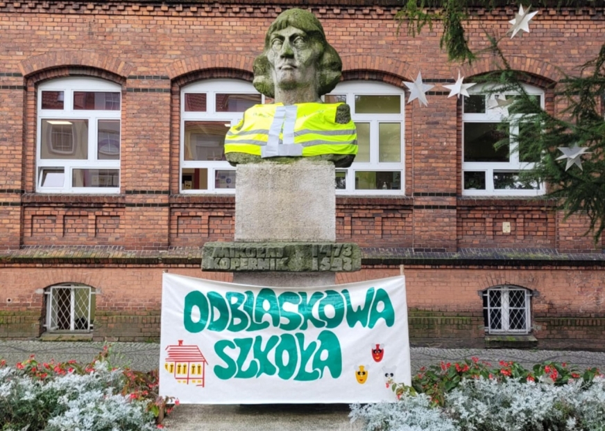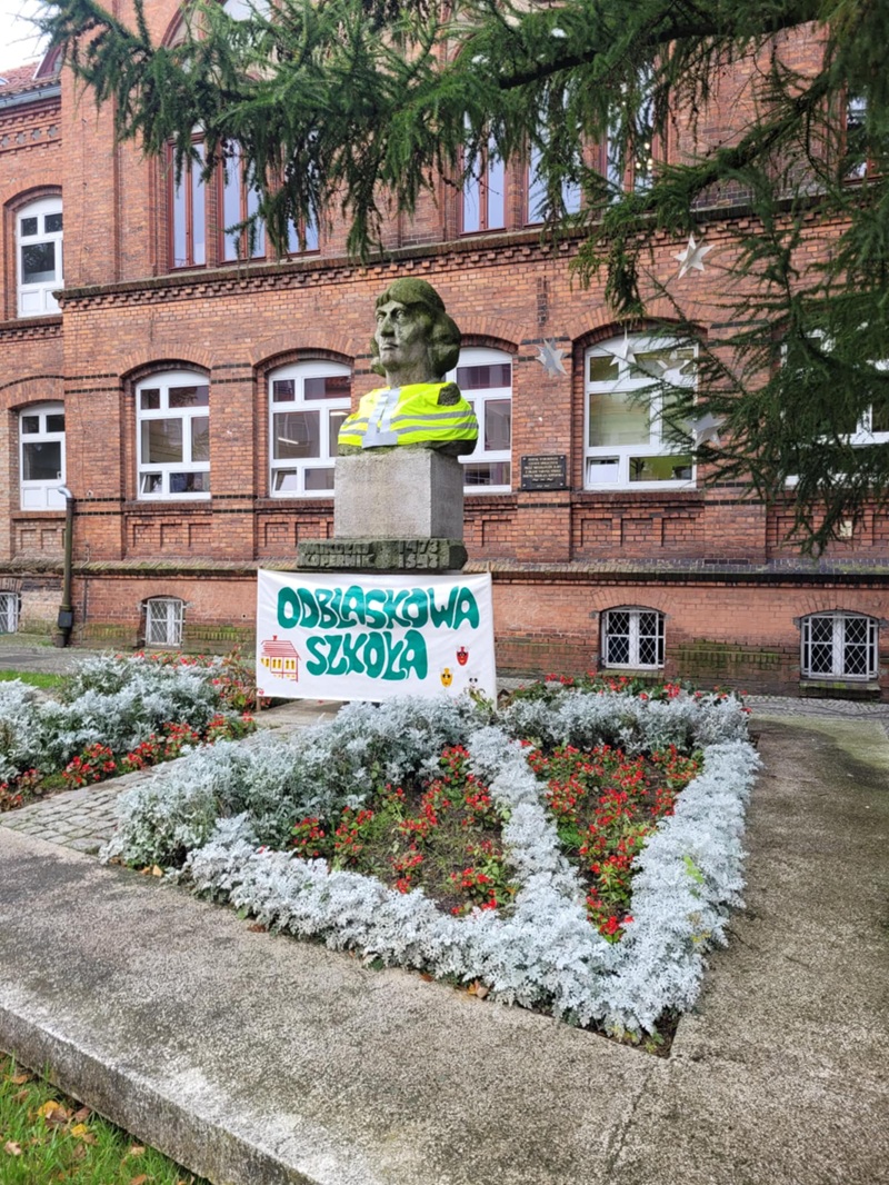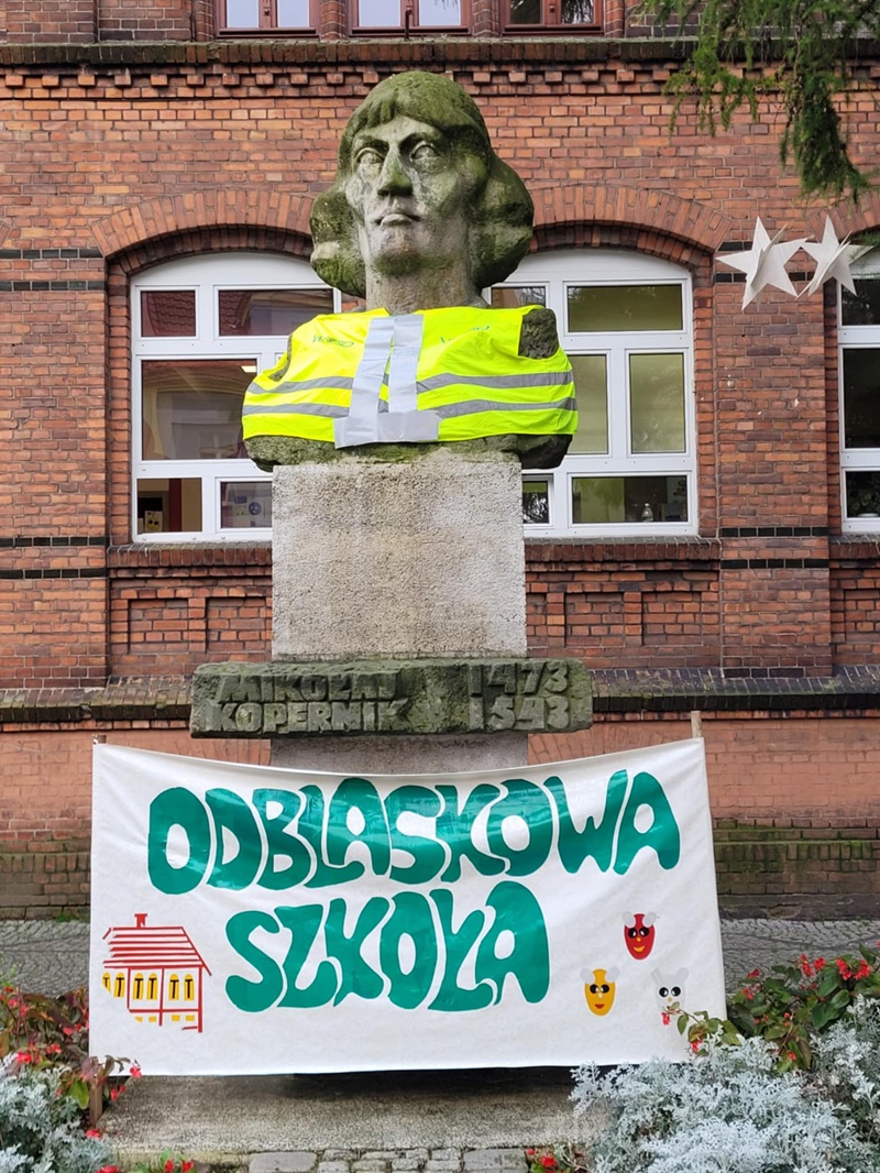 To za sprawą szkolnej akcji popiersie astronoma zyskało niedawno odblaskową kamizelkę. A umieszczony na cokole pomnika baner informuje mieszkańców o uczestnictwie „Kopernika” w ogólnopolskim konkursie „Odblaskowa szkoła”, którego celem jest promowanie niepozornych, ale mających wielką moc odbijających światło elementów.