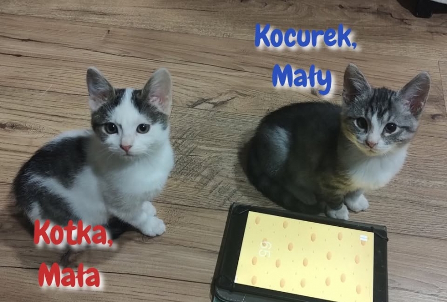 Pierwsze dwa to rodzeństwo, brat i siostra. Biała to kotka zwana po prostu Małą, bury to chłopczyk zwany Małym. Była ich czwórka, niestety jedna z sióstr nie przeżyła, druga natomiast znalazła wspaniały dom. Teraz one czekają na swoją szansę. Mają kontakt z dorosłymi kocimi rezydentami, poznały się też z psem. Uwielbiają zabawę, ale i kontakt z człowiekiem.