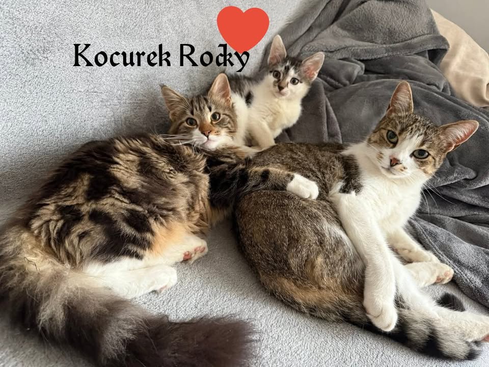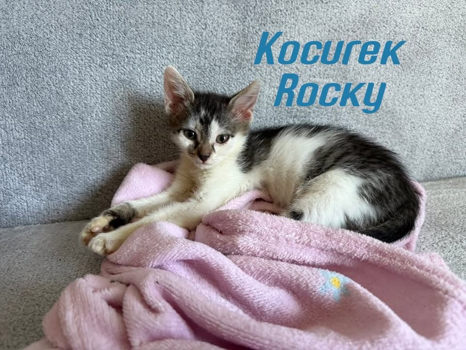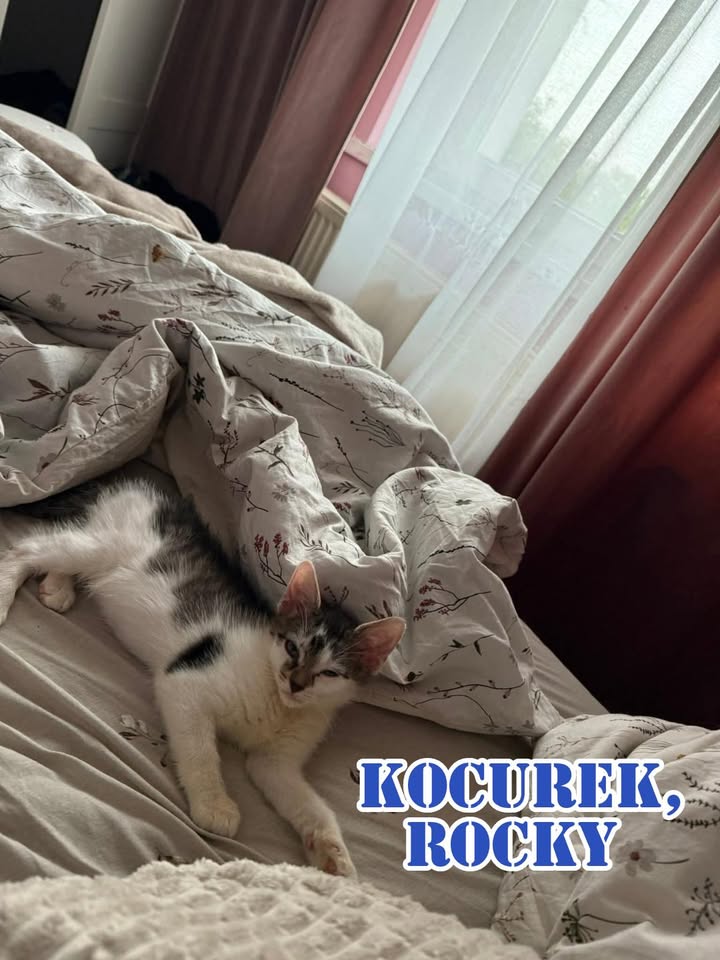 Trzeci maluch to kocurek Rocky. Jego brat znalazł już domek, a on nadal czeka. Uwielbia przytulanie i bliskość człowieka. Bardzo też lubi wylegiwać się w kocyku lub kołderce, co widać na zdjęciach. Mieszka z innymi kotami i psami, więc doskonale nada się do domu, w którym już są zwierzęta.