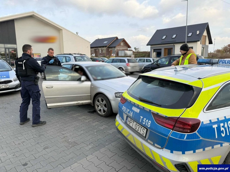 Niecodzienne sceny oglądali na parkingu klienci jednego z lokalnych marketów. Zatrzymanie, kontrola – i kierujący ani nie zrobił zakupów, ani nie mógł już kontynuować podróży...