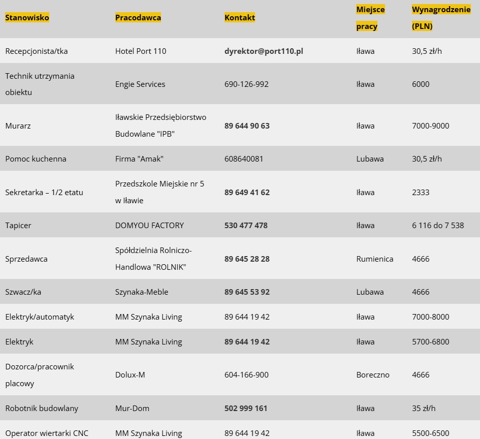 Jak co poniedziałek mamy dla Was przegląd najnowszych ofert pracy dostępnych w Iławie i w powiecie. Tym razem jest ich około 20. Oferty pochodzą z bazy Powiatowego Urzędu Pracy w Iławie, z ostatnich 7 dni.