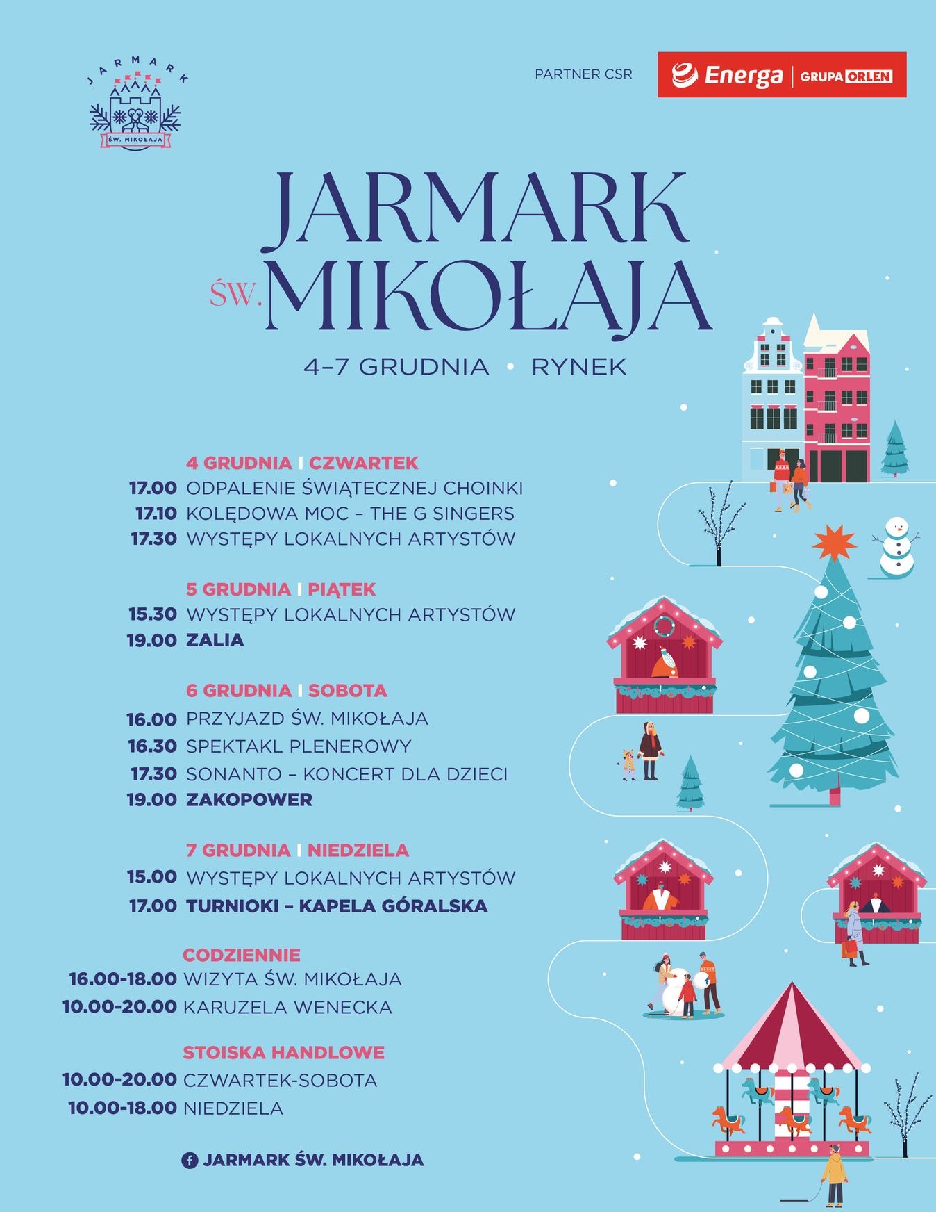 W czwartek, 4 grudnia, o godzinie 17:00 uroczyste odpalenie choinki oficjalnie otworzy jarmark. Tuż po tym na scenie pojawią się The G Singers z koncertem „Kolędowa Moc”, a wieczór wypełnią występy lokalnych artystów.