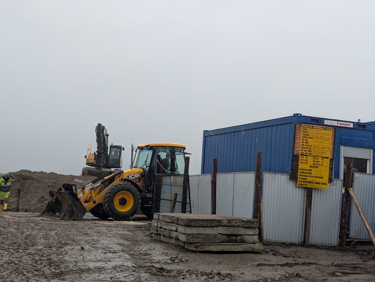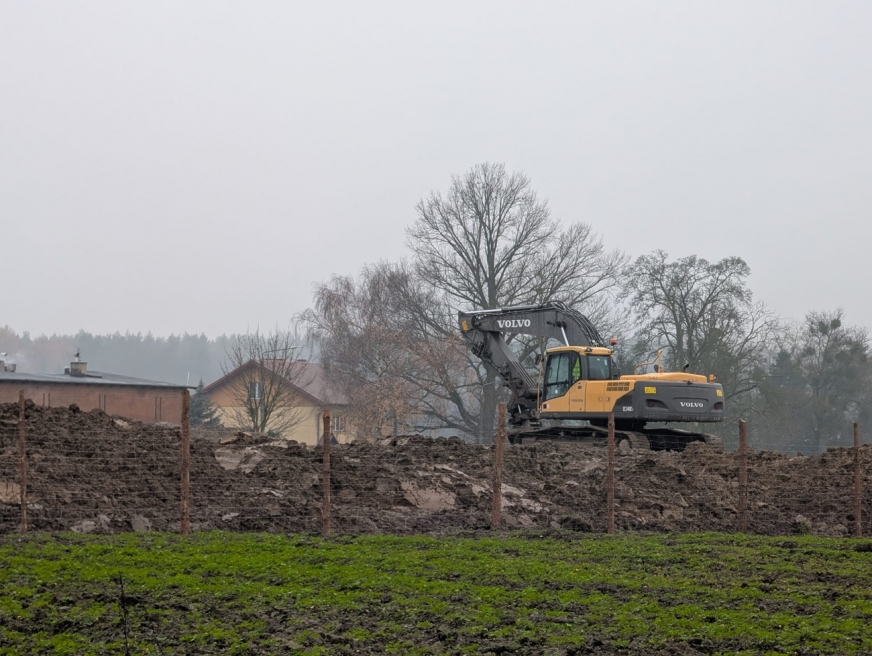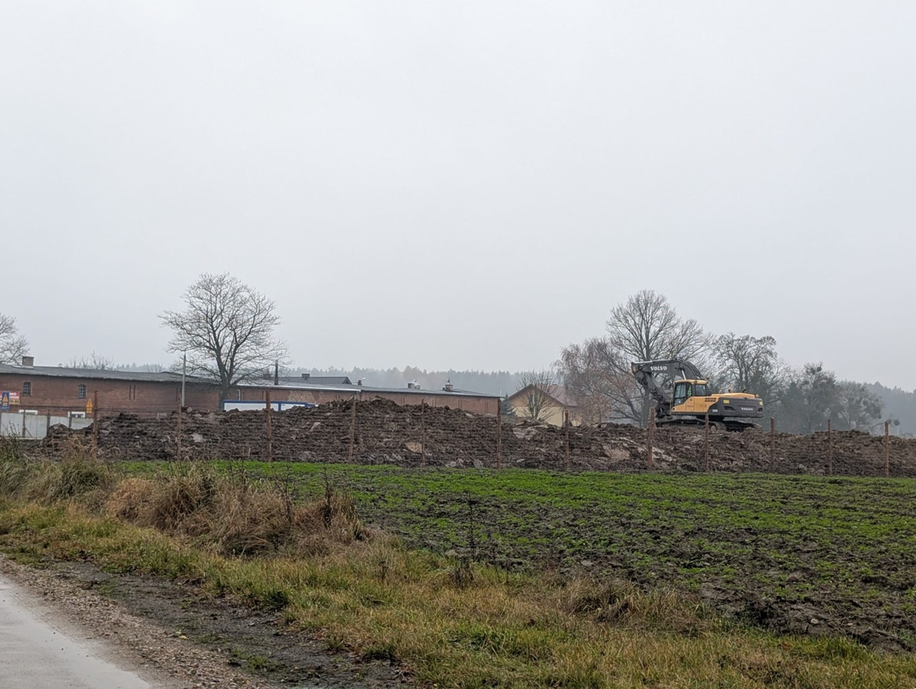 Przy głównej drodze w miejscowości Dziarny budowa bloku SIM rozpoczyna się od robót ziemnych. Na ogrodzonej działce pracuje już ciężki sprzęt z Iławskiego Przedsiębiorstwa Budowlanego "IPB", bo - przypomnijmy - to właśnie ta spółka, świetnie znana w Iławie i nie tylko, zwyciężyła w przetargu ogłoszonym przez SIM KZN Warmia i Mazury – spółkę, do której w celu realizacji projektu SIM przystąpił samorząd Gminy Iława.