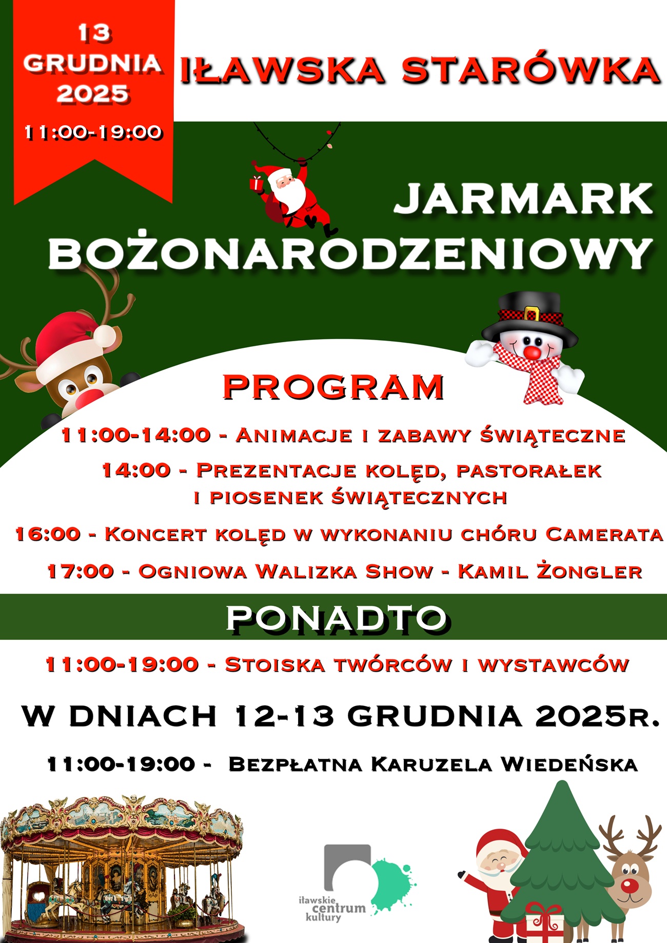 Iława rozpoczęła przygotowania do corocznego Jarmarku Bożonarodzeniowego. To jedno z tych wydarzeń, które wprowadzają w mieście świąteczną atmosferę i gromadzą zarówno mieszkańców, jak i gości z okolicy. Tegoroczna edycja odbędzie się w sobotę, 13 grudnia, w godzinach 11:00–19:00, na iławskiej starówce.