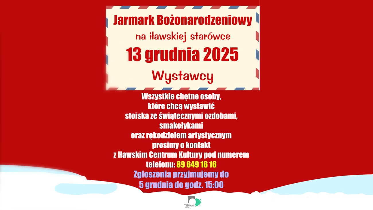 Obecnie trwa nabór wystawców zainteresowanych udziałem w wydarzeniu. Zgłaszać się mogą osoby oferujące ozdoby, rękodzieło oraz wyroby związane z tematyką świąteczną. Zgłoszenia przyjmowane są do 5 grudnia do godziny 15:00, a wszelkich informacji udziela Iławskie Centrum Kultury pod numerem telefonu 89 649 16 16.
