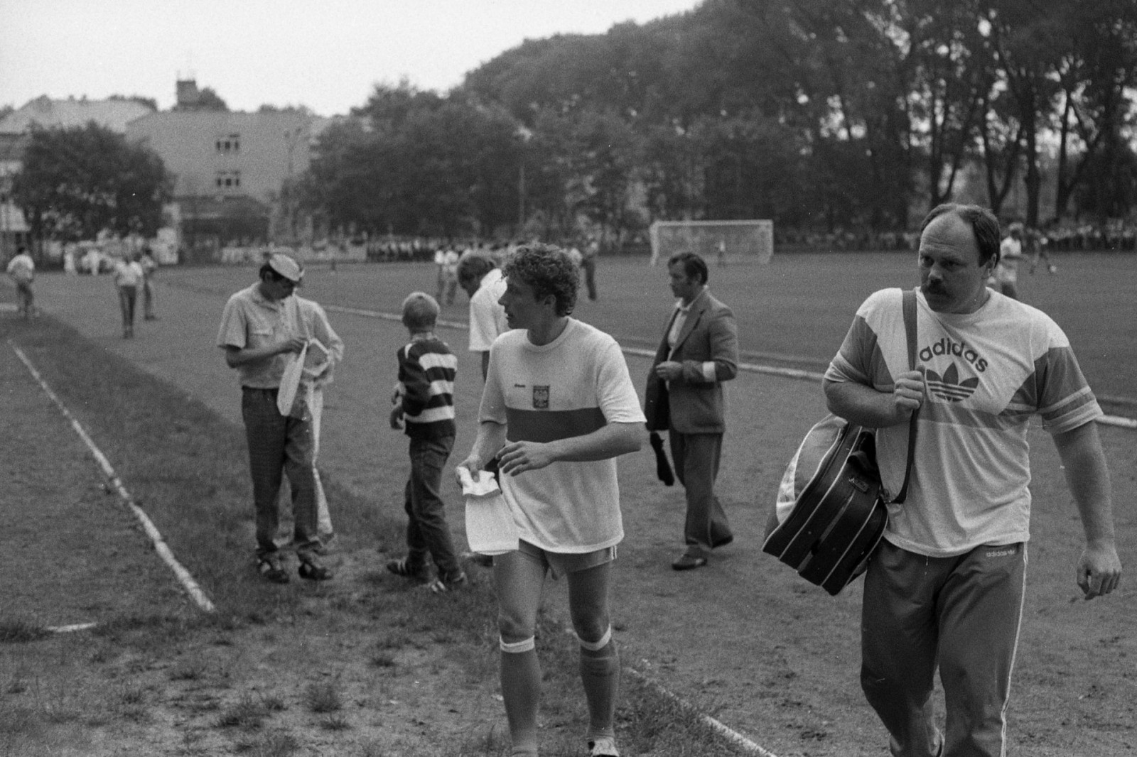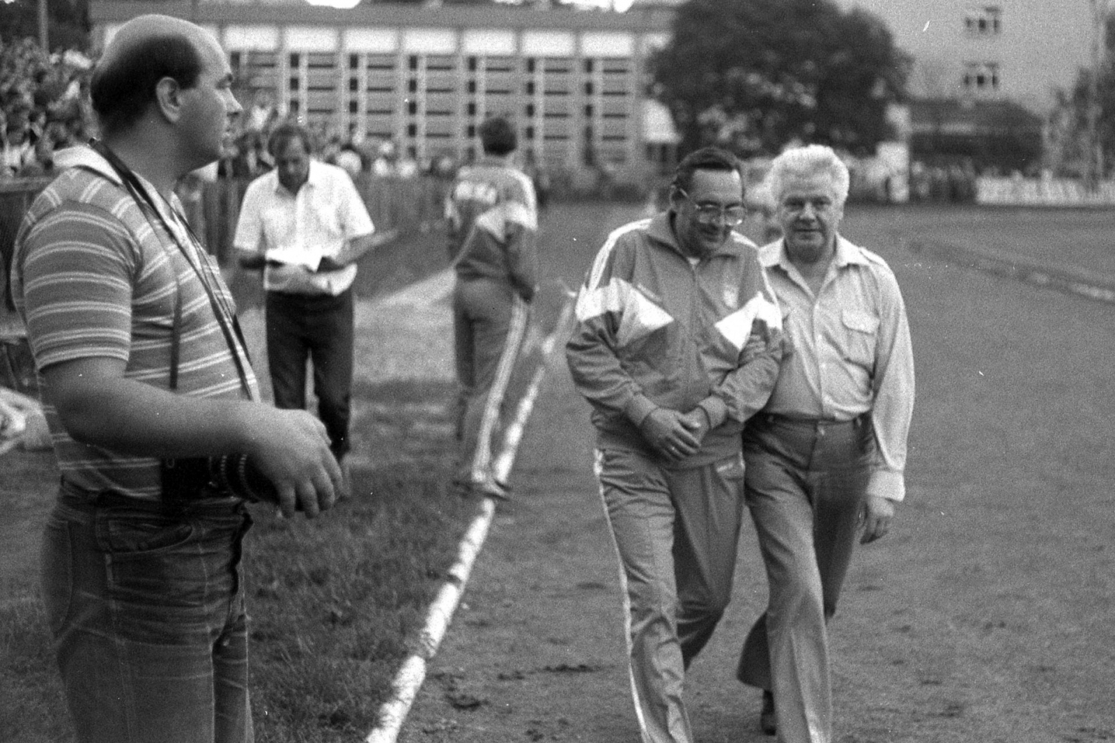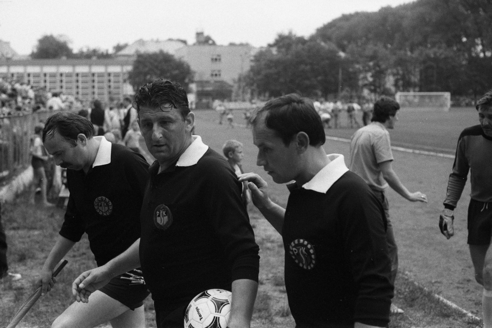 Trójka sędziowska schodzi z boiska tuż po meczu Jeziorak Iława - Kadra PZPN. Pierwszy z lewej - iławianin Zbigniew Szczypiński. Dalej, od lewej: Stefan Banasik (sędzia główny) i Marian Gołąb (także sędzia boczny) (fot. Andrzej Musiński)