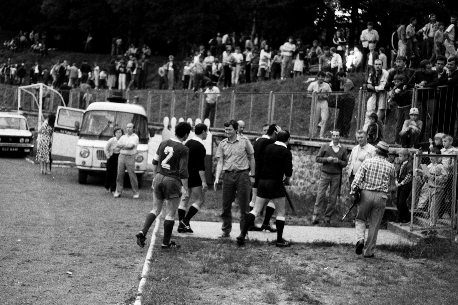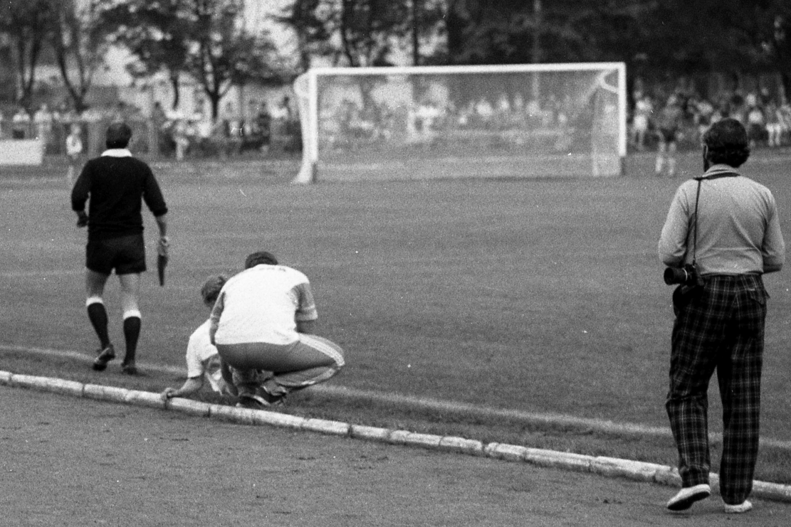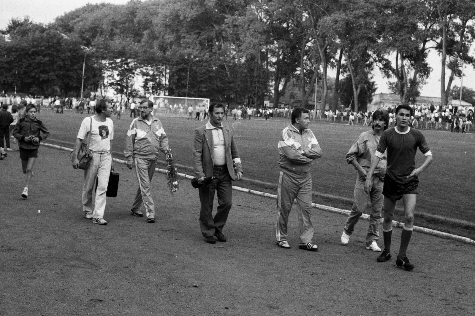 Trójka sędziowska schodzi z boiska tuż po meczu Jeziorak Iława - Kadra PZPN. Pierwszy z lewej - iławianin Zbigniew Szczypiński. Dalej, od lewej: Stefan Banasik (sędzia główny) i Marian Gołąb (także sędzia boczny) (fot. Andrzej Musiński)
