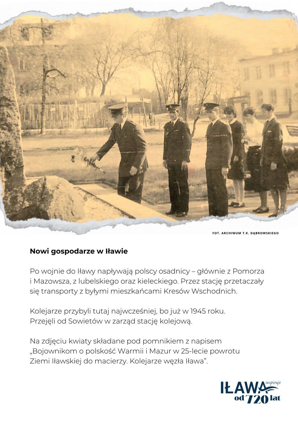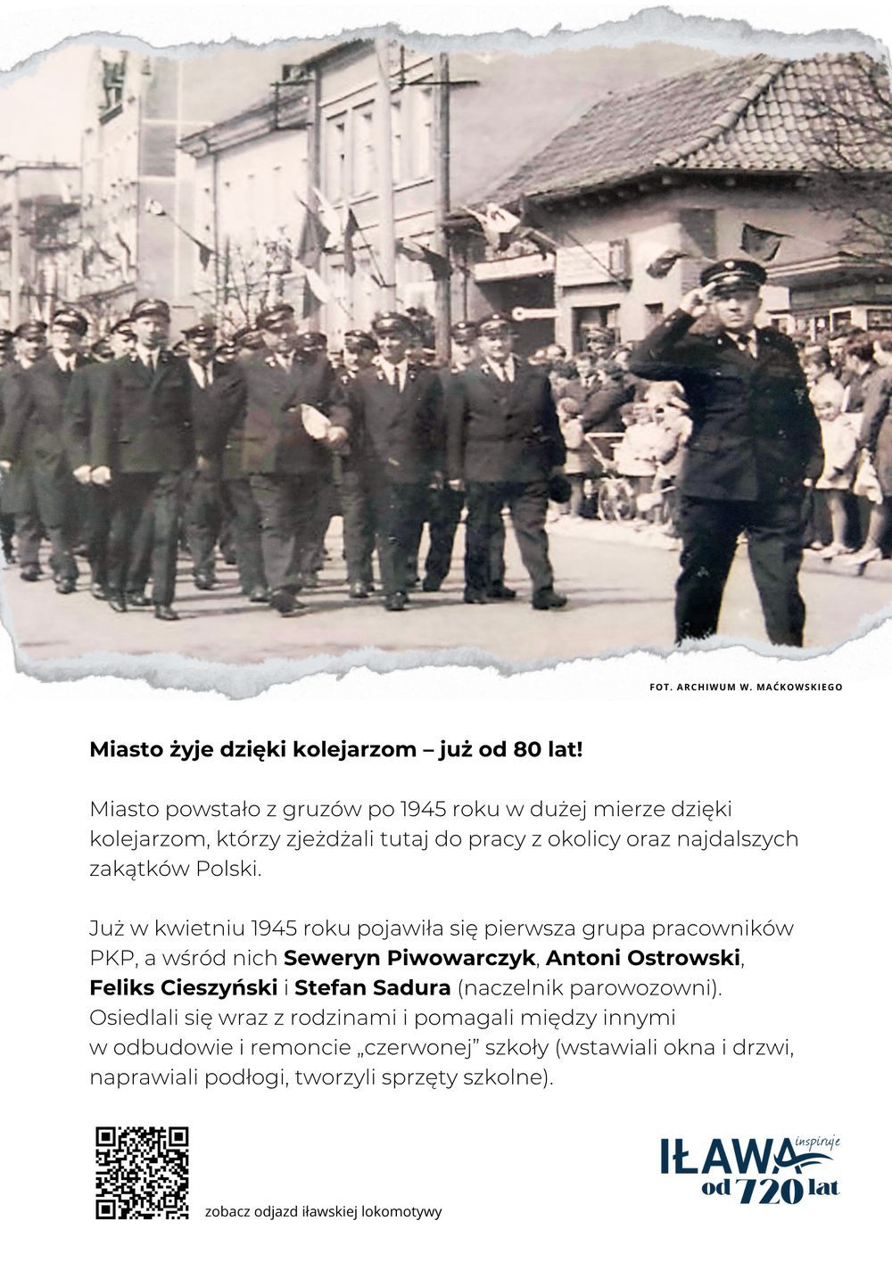To oni, jako jedni z pierwszych, pojawili się w zniszczonej Iławie tuż po zakończeniu wojny. W kwietniu 1945 roku dotarła tu pierwsza grupa pracowników PKP, wśród których byli: Seweryn Piwowarczyk, Antoni Ostrowski, Feliks Cieszyński i Stefan Sadura – ówczesny naczelnik parowozowni. Przyjechali z rodzinami, zakasali rękawy i włączyli się w odbudowę miasta. Do Iławy napływali przede wszystkim mieszkańcy Pomorza, Mazowsza, Lubelszczyzny i Kielecczyzny. Kolej szybko stała się naturalnym centrum życia społecznego.