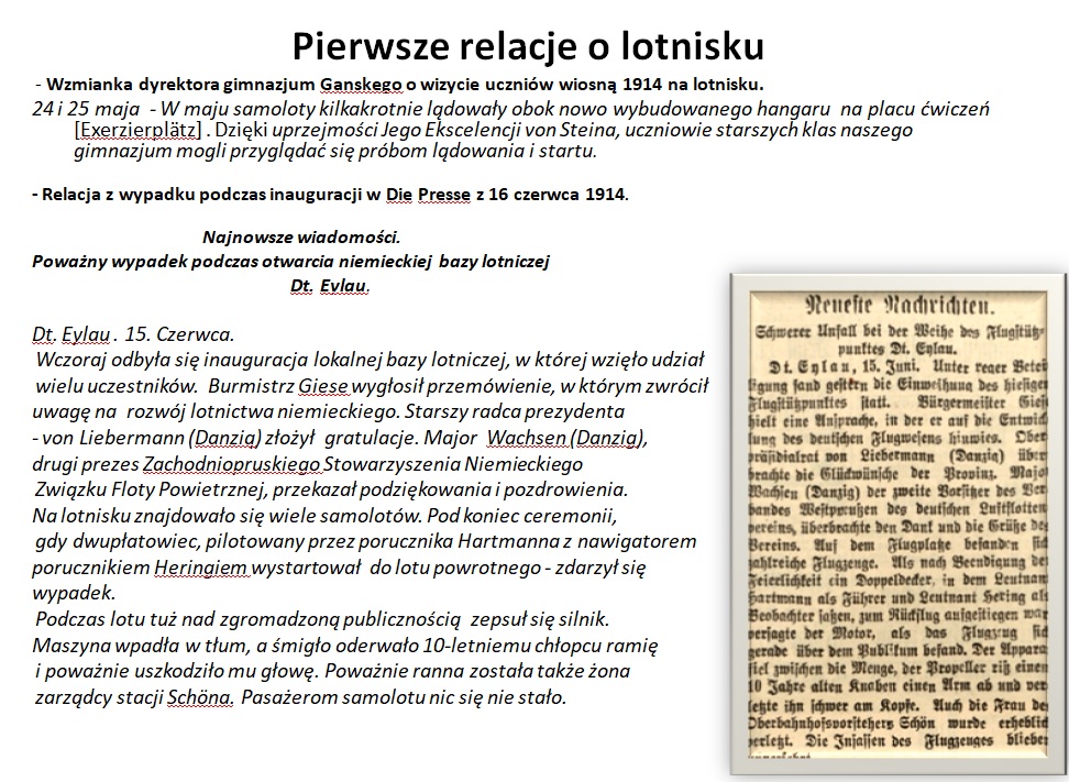 „Dt. Eylau . 15. Czerwiec. Wczoraj odbyła się inauguracja lokalnej bazy lotniczej, w której wzięło udział wielu uczestników. Burmistrz Giese wygłosił przemówienie, w którym zwrócił uwagę na rozwój lotnictwa niemieckiego. Starszy Radca prezydenta von Liebermann (Danzig) przekazał gratulacje,. Major Wachsen (Danzig), drugi prezes Zachodniopruskiego Stowarzyszenia Niemieckiego Związku Floty Powietrznej, przekazał klubowi podziękowania i pozdrowienia.