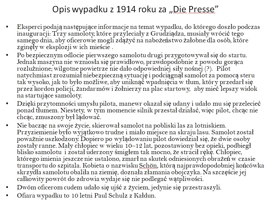 Na lotnisku znajdowało się wiele samolotów. Pod koniec ceremonii z lotniska wystartował dwupłatowiec, pilotowany przez porucznika Hartmanna z obserwatorem porucznikiem Heringiem. Gdy samolot znajdował się tuż nad publicznością, zepsuł się silnik. Maszyna opadła w tłum, a śmigło oderwało 10-letniemu chłopcu ramię i poważnie uszkodziło mu głowę. Poważnie ranna została także żona zarządcy stacji Schöna. Pasażerom samolotu nic się nie stało.”