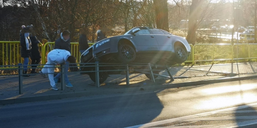 Do zdarzenia doszło około godziny 14:30, a akcja na ul. Konstytucji 3 Maja trwała prawie do 16:00. To dlatego, że na miejsce trzeba było wezwać dźwig, który podniósł audi z barierek mostu i następnie umieścił auto na lawecie.