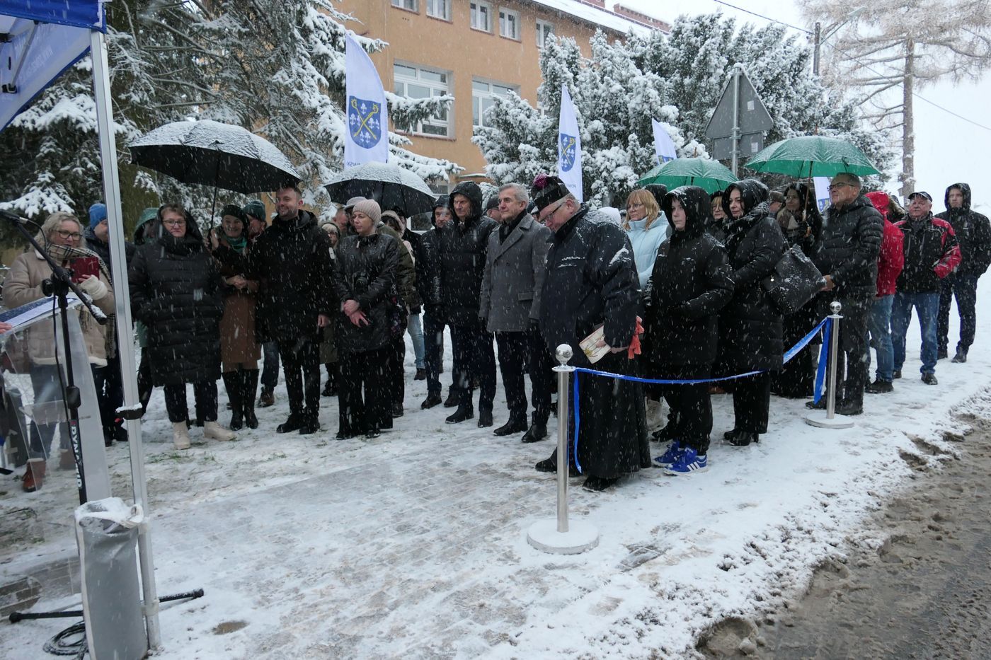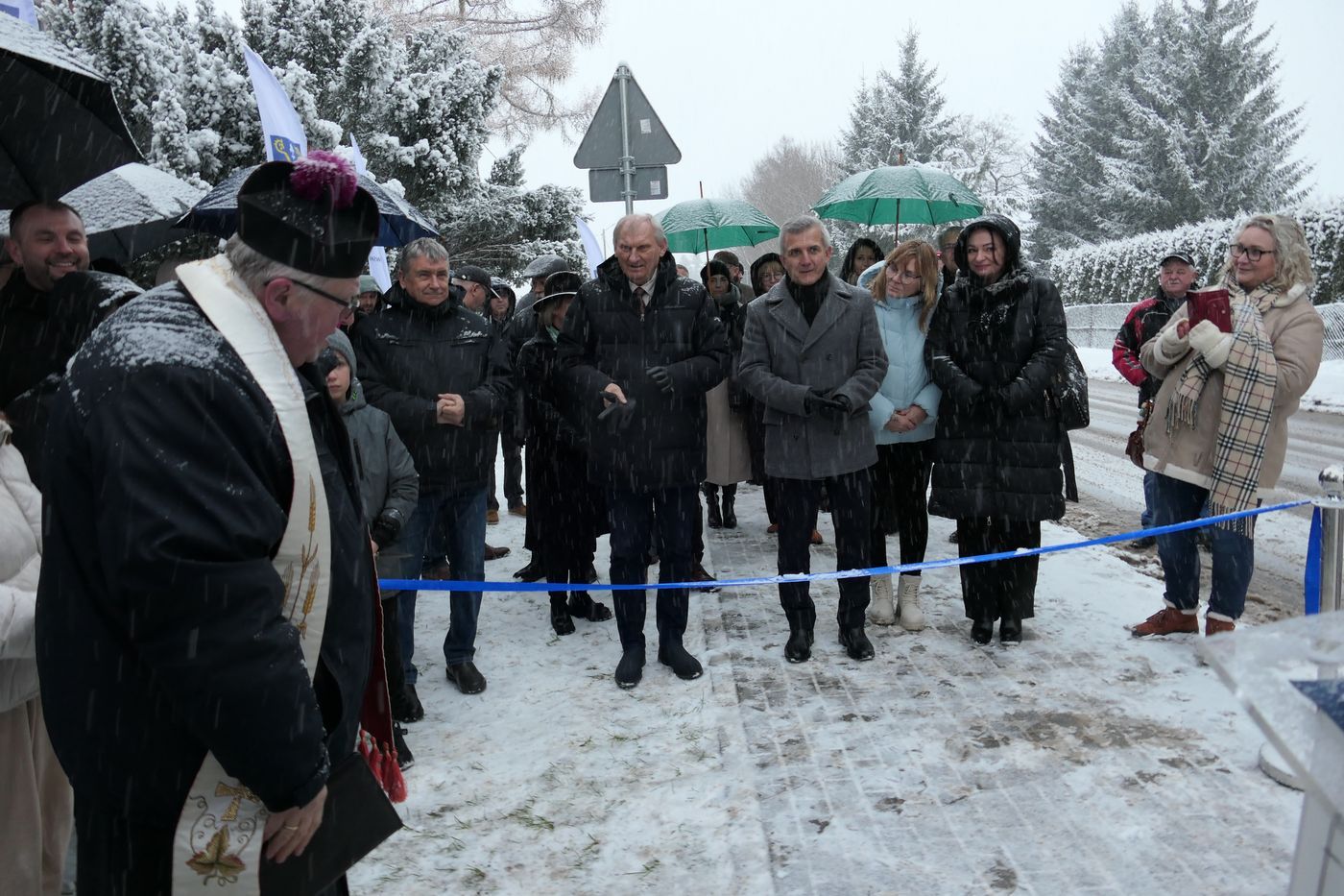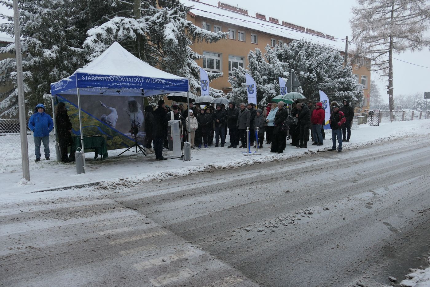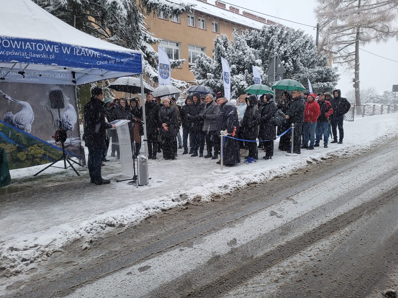 W wyjątkowo białych "okolicznościach przyrody", wśród zacinających opadów intensywnego śniegu, miała miejsce dzisiejsza uroczystość symbolicznego przecięcia wstęgi drogowej inwestycji na drodze Powiatu Iławskiego w Rudzienicach. Po dokonaniu oficjalnego otwarcia gruntownie przebudowanego odcinka spotkanie przeniosło się z ulicy Długiej do miejscowej świetlicy.