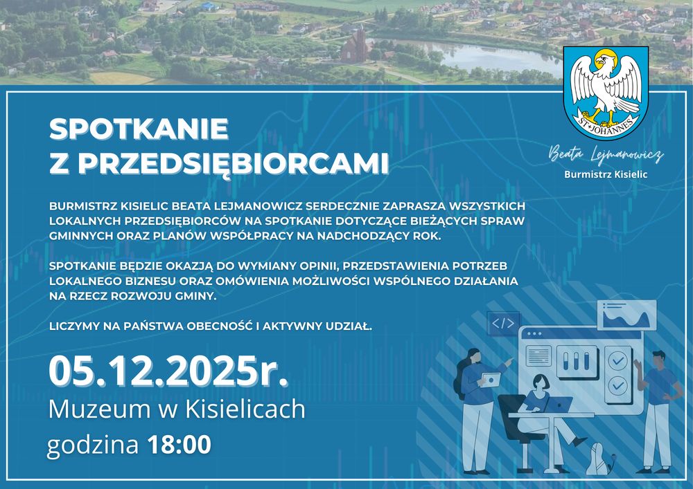 Burmistrz Beata Lejmanowicz zaprasza lokalnych przedsiębiorców na otwarte spotkanie poświęcone współpracy i planom gminy na 2026 rok. Dobra okazja, by porozmawiać o potrzebach lokalnego biznesu.