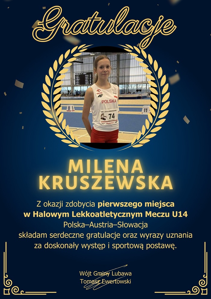 Reprezentanci Polski zdominowali międzynarodowy mecz lekkoatletyczny drużyn do lat 14, który odbył się 29 listopada w Wiedniu. Jedną z zawodniczek przyczyniających się do tego sukcesu była Milena Kruszewska z Mortąg, uczennica Szkoły Podstawowej w Tuszewie i zawodniczka LKS Lubawa.