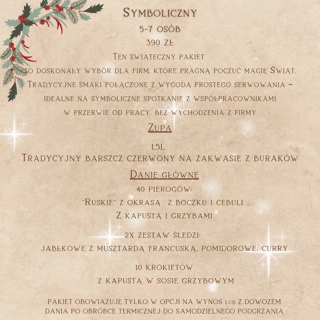 To pakiet na wynos lub z dowozem - propozycja dla tych, którzy chcą podzielić się świątecznym smakiem w prosty, niewymuszony sposób. Tradycyjny barszcz na zakwasie, pierogi z okrasą, śledzie w delikatnych marynatach, krokiety pachnące grzybami — wszystko podane tak, aby nawet krótkie spotkanie w pracy stało się chwilą odpoczynku i ciepłej wymiany myśli. Prosty, ale nie banalny. Klasyczny, ale z charakterem. Pakiet Symboliczny to propozycja dla grupy od 5 do 7 osób.
