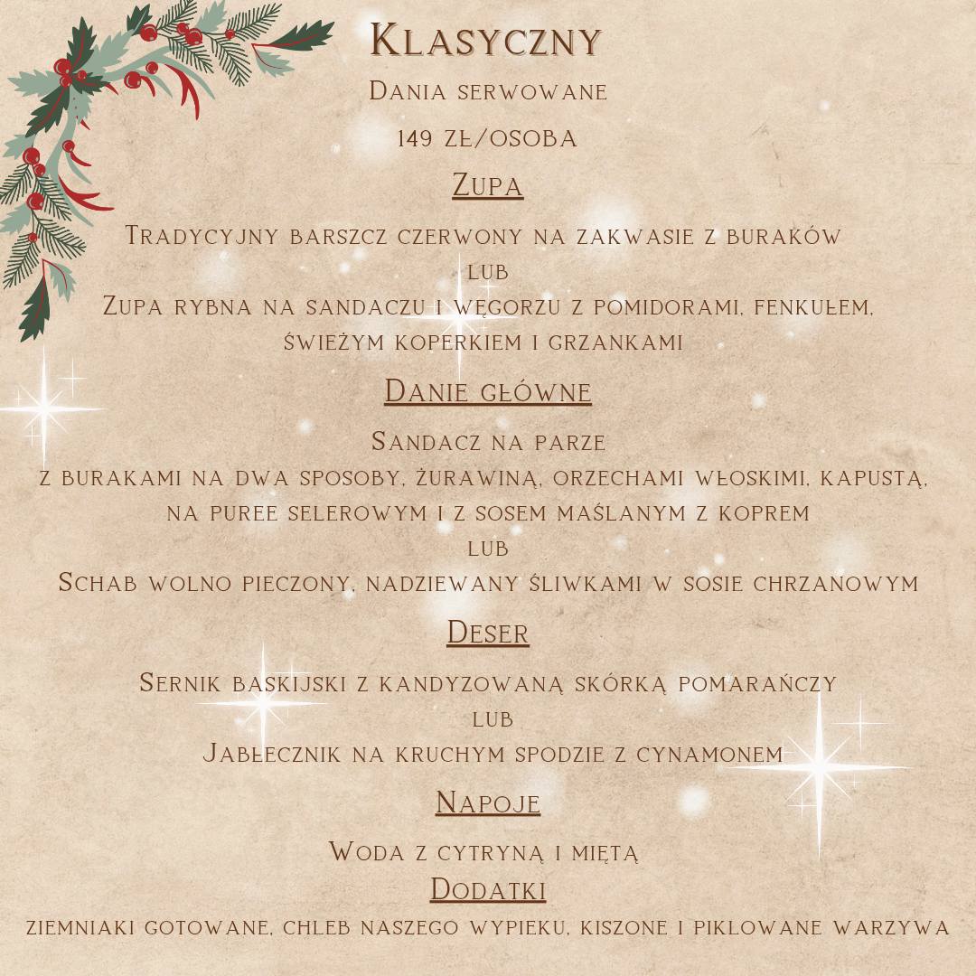 To wariant zachowujący wszystko, co najważniejsze w wigilijnej tradycji. Na Waszych talerzach znajdą się elegancki barszcz na zakwasie lub aromatyczna zupa rybna na sandaczu i węgorzu – dzięki dodatkowi kopru włoskiego smak jest naprawdę wyjątkowy! A danie główne? Skosztujecie sandacza na parze z maślanym, selerowym puree albo świątecznego, wolno pieczonego schabu – śliwki i chrzanowy sos robią tu robotę! I wreszcie deser – baskijski sernik będzie pachniał pomarańczą, a jabłecznik na kruchym spodzie – cynamonem. Pychota! A te wszystkie wigilijne pyszności zostaną Wam zaserwowane w ozdobionej i rozświetlonej lampkami restauracji, gdzie odświętne obrusy i zastawione stoły tylko czekają, abyście przy nich zasiedli.