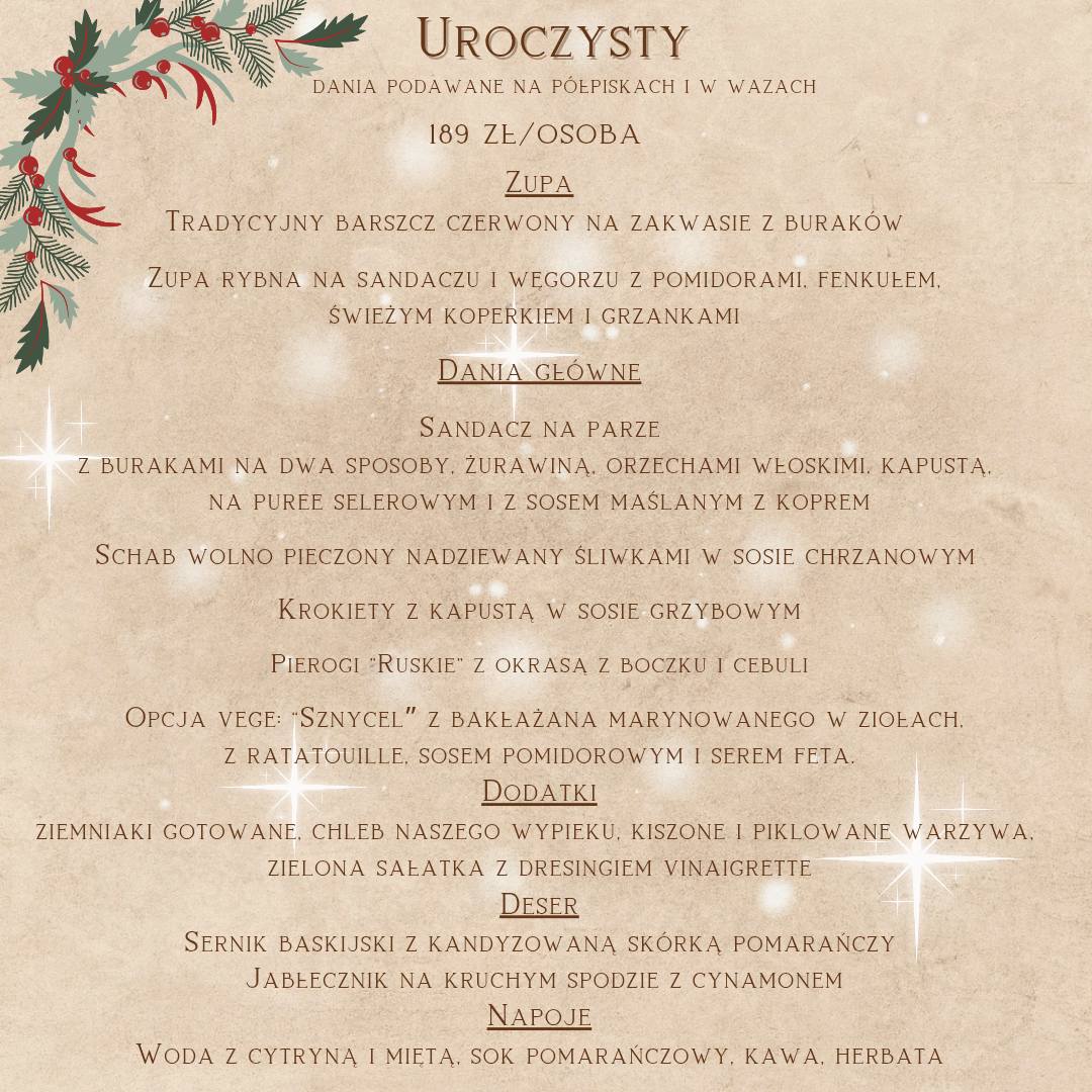 Tu świętowanie nabiera eleganckiej oprawy. Goście otrzymują dania serwowane na półmiskach i w wazach — tak, by każdy mógł czerpać z nich swobodnie, jak podczas rodzinnej kolacji. Sandacz z burakami i żurawiną, schab pieczony powoli i nadziewany śliwkami, kremowy sos maślany z koperkiem, pierogi i krokiety, a także domowe wypieki i pełna paleta dodatków — to kuchnia, w której sezonowe produkty i tradycja spotykają się ze współczesnym, subtelnym smakiem. To propozycja dla firm i przyjaciół, którzy pragną celebrować ten wieczór w naprawdę wyjątkowej odsłonie.