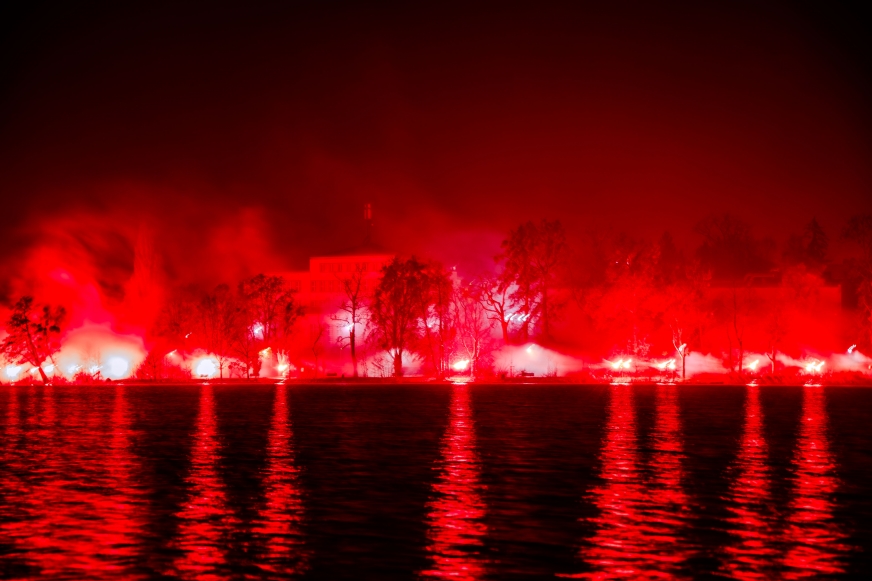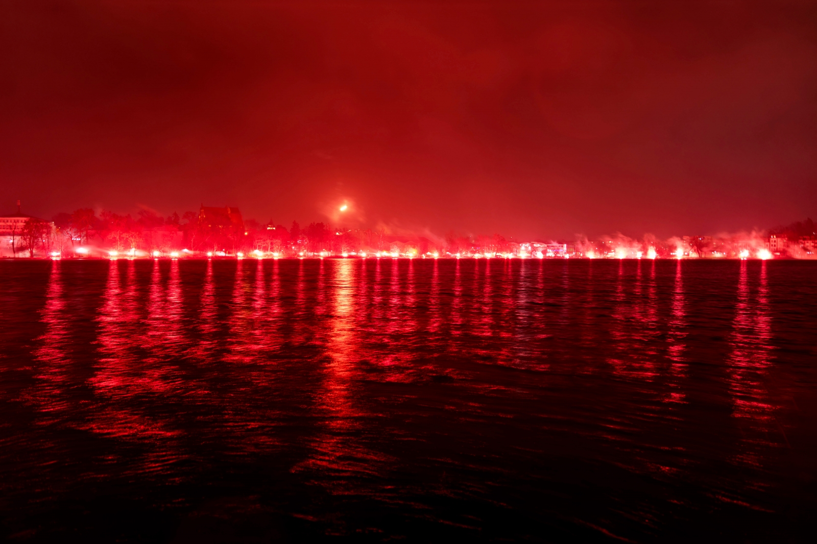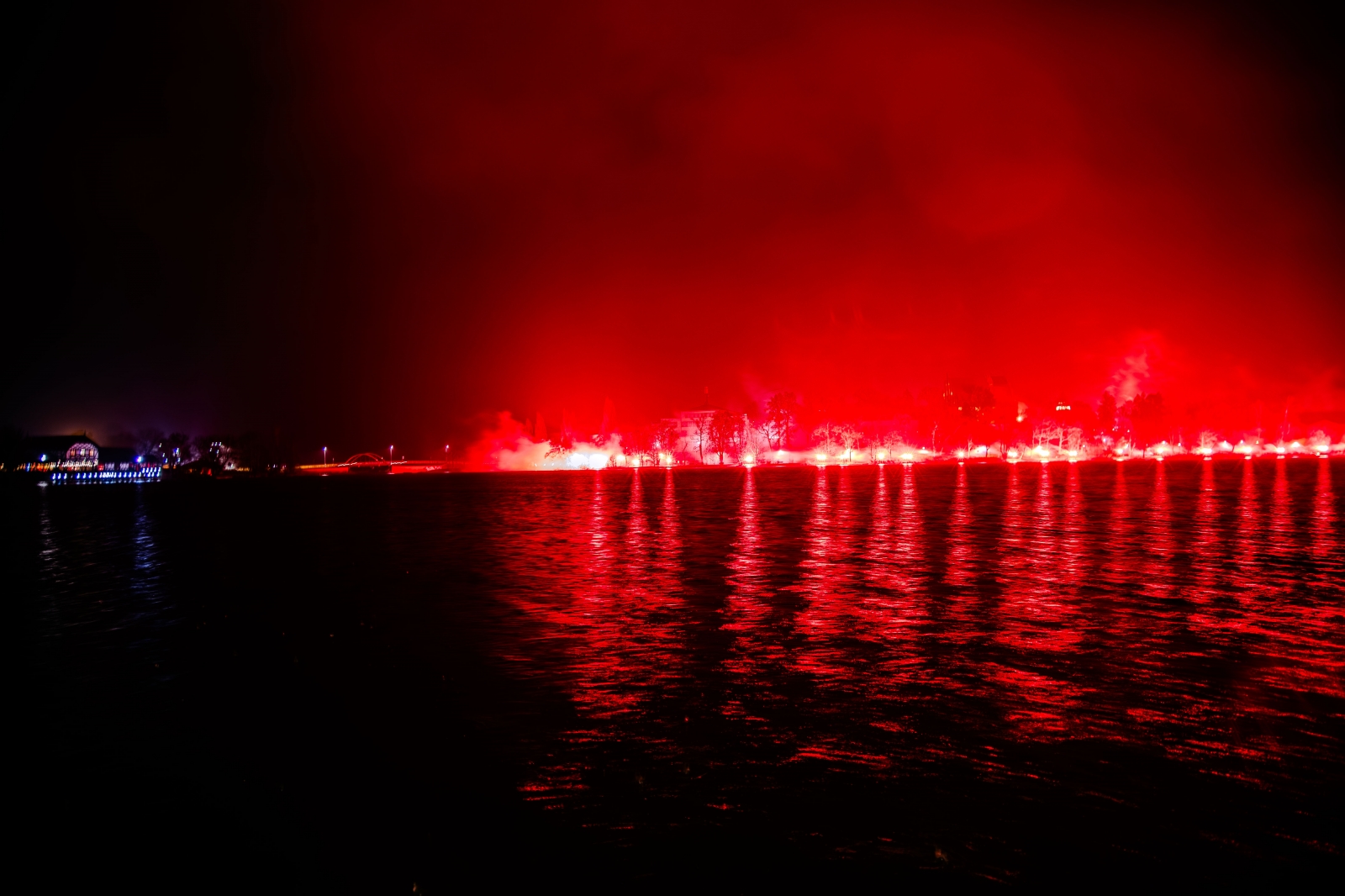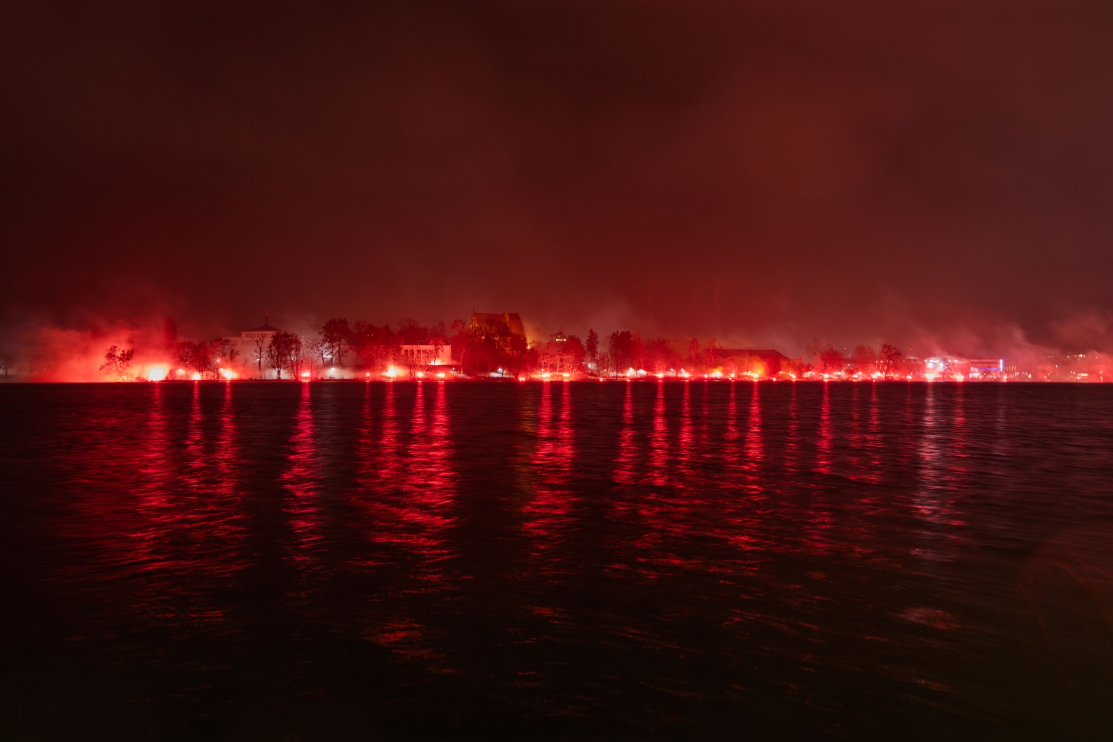 Sobota 6 grudnia 2025, godzina 19:45, centrum Iławy. Cały północny brzeg Małego Jezioraka zapłonął w jednym momencie światłem 80 rac! Następnie nastąpił pokaz pirotechniczny. Wszystko to z okazji 80. urodzin klubu sportowego z ul. Sienkiewicza. Jakby symboliki było mało, to na naszym nagraniu tych „ognistych” urodzin załapał się jeszcze przejeżdżający pociąg. A to przecież kolejarze założyli Jeziorak w Mikołajki 1945 roku. I kibice IKS, którzy zorganizowali wczorajszy pokaz, doskonale o tym pamiętają.