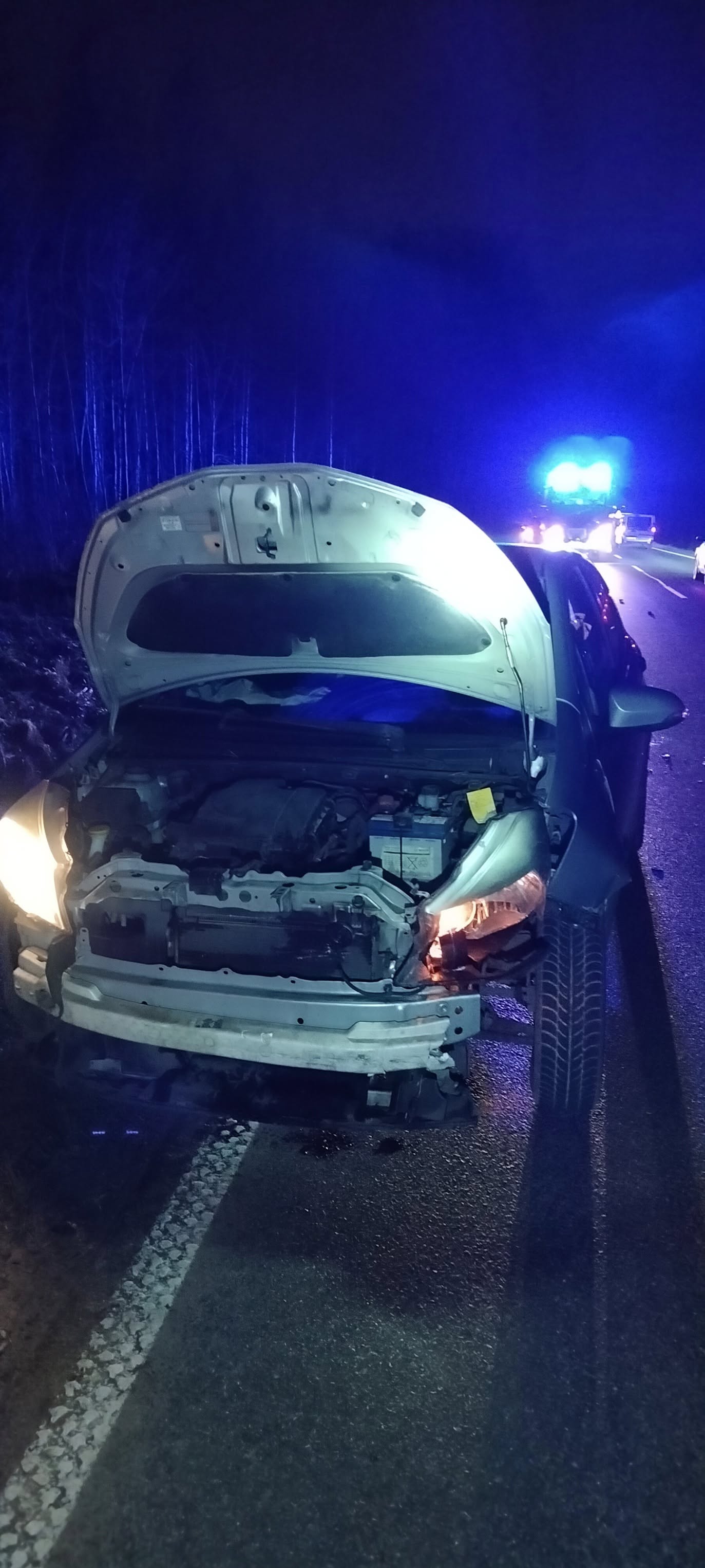 W piątek, 12 grudnia, po godzinie 18 służby zostały zadysponowane do kolizji, w której samochód osobowy marki Toyota Yaris zderzył się z dzikiem. Pojazdem podróżowały dwie osoby. Na szczęście żadna z nich nie odniosła obrażeń i nie było konieczności udzielania pomocy medycznej.