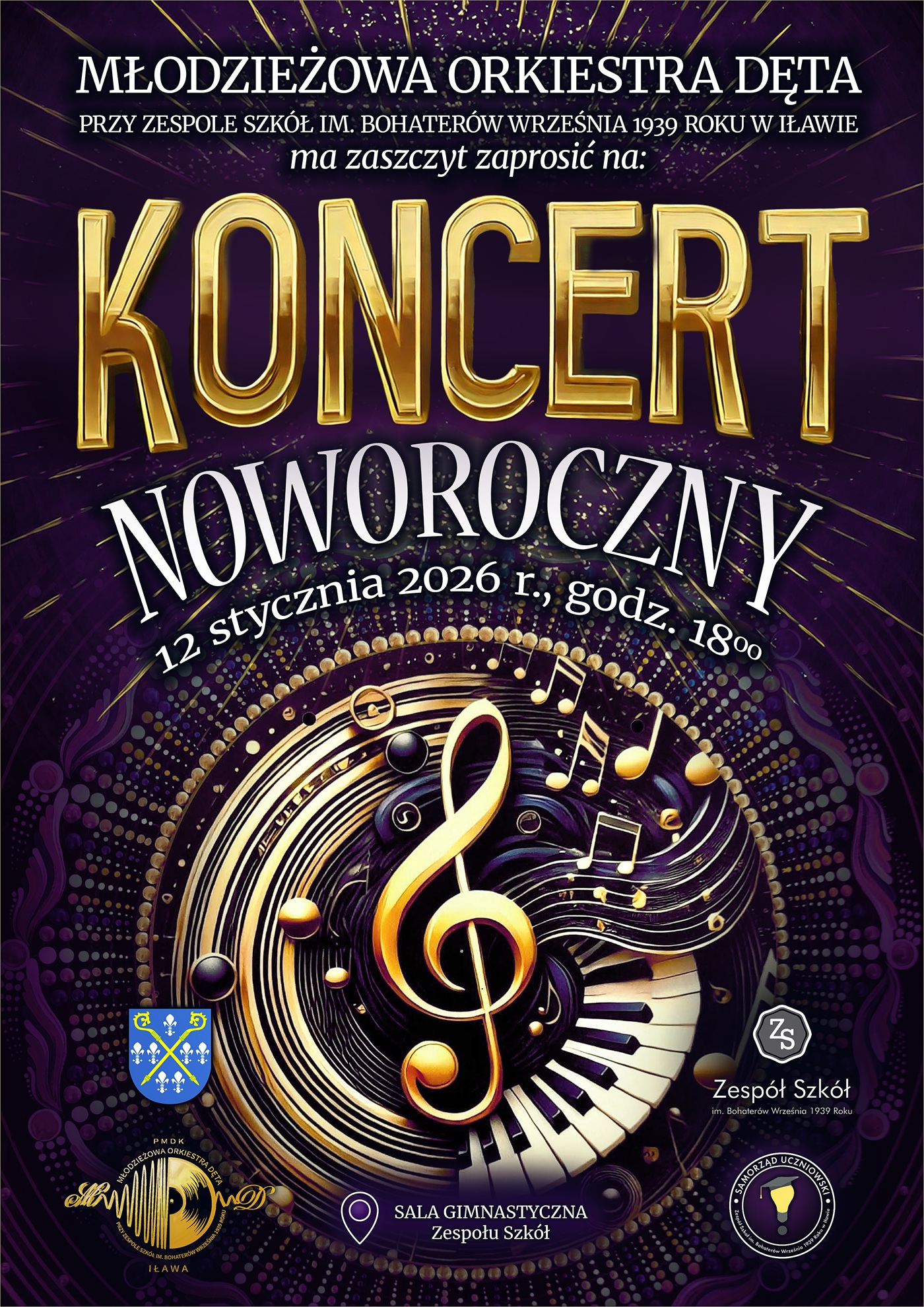 W imieniu organizatorów - Samorządu Uczniowskiego oraz Zespołu Szkół im. Bohaterów Września 1939 roku w Iławie zapraszamy Was na Koncert Noworoczny. Obędzie się on w poniedziałek 12 stycznia, o godz. 18.00, w sali gimnastycznej Zespołu Szkół im. Bohaterów Września 1939 roku w Iławie (ul. Mikołaja Kopernika 8A).
