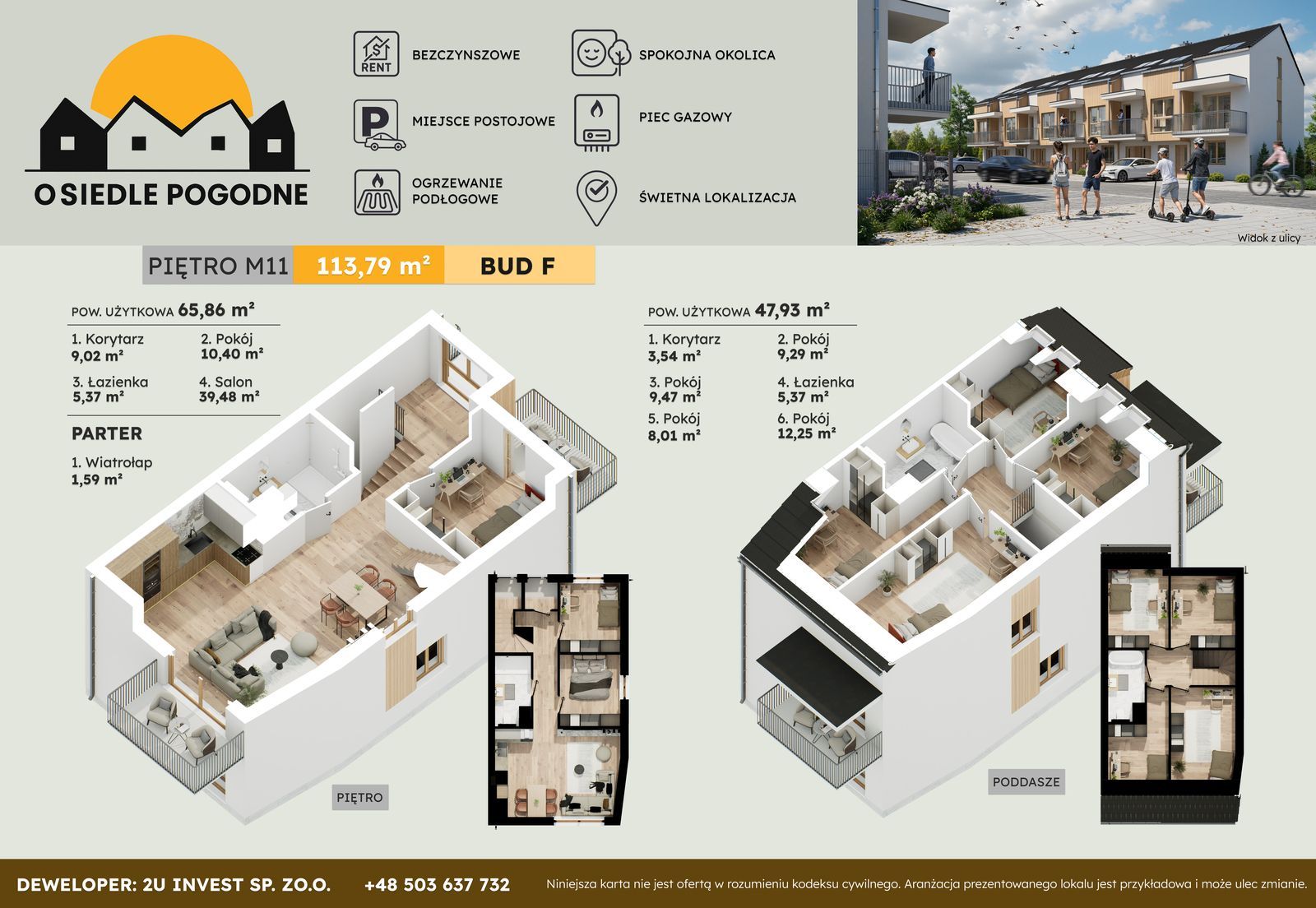 Osiedle Pogodne zaprojektowano jako niewielką, kameralną zabudowę, co już na starcie odróżnia je od dużych, gęsto zabudowanych kompleksów. Inwestor postawił na lokale bezczynszowe, co oznacza brak comiesięcznych opłat administracyjnych i większą kontrolę nad kosztami utrzymania mieszkania. W standardzie każdego lokalu znalazło się ogrzewanie podłogowe oraz indywidualny piec gazowy, rozwiązania cenione zarówno za komfort użytkowania, jak i efektywność energetyczną. Mieszkania na parterze zyskują dodatkową przestrzeń w postaci prywatnych ogródków, które mogą pełnić funkcję miejsca wypoczynku lub domowej strefy rekreacyjnej, natomiast lokale położone na piętrze będą miały balkony i dobrze doświetlone poddasza. W cenie każdego lokalu przewidziano także miejsce postojowe, co w praktyce eliminuje problem parkowania. Całość uzupełnia lokalizacja – spokojna, zielona część Iławy z szybkim dostępem do Jezioraka i terenów rekreacyjnych, takich jak plaża, marina, ścieżki spacerowe i rowerowe, a jednocześnie dobrze skomunikowana z resztą miasta.