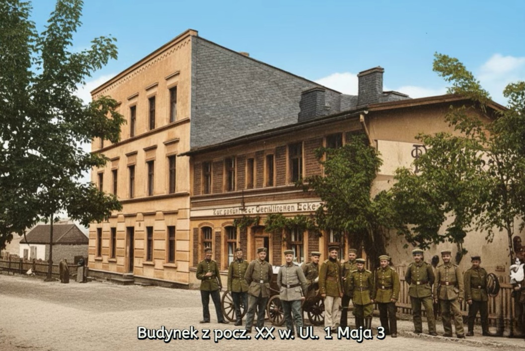 W miejskiej ewidencji zabytków jest natomiast położony prawie po sąsiedzku budynek mieszkalny na ul. 1 Maja 3. Jak on prezentuje się dziś, a jak wyglądał przed wojną? Niestety upływający czas nie był łaskawy, budynek obecnie jest w złym stanie i wymaga remontu. Zdjęcie historyczne zostało poddane retuszowi przez Krzysztofa Zakretę, zdjęcie współczesne jest jego autorstwa.