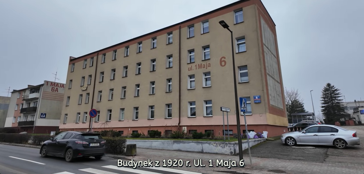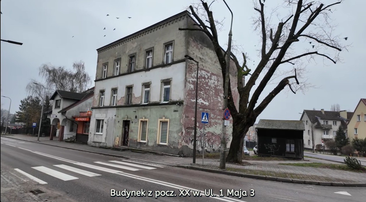 Ulica 1 Maja 6 - to jeszcze przedwojenny budynek. Choć na pierwszy rzut oka aż trudno w to uwierzyć - dokładnie ten sam, co na głównym zdjęciu. Fot. kadr z filmu Krzysztofa Zakrety.