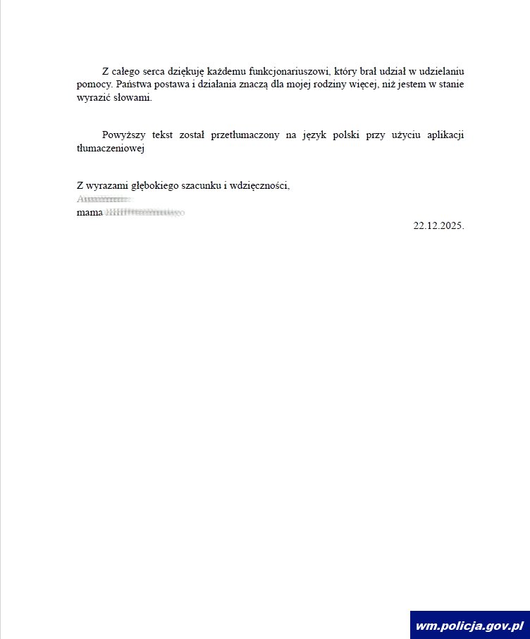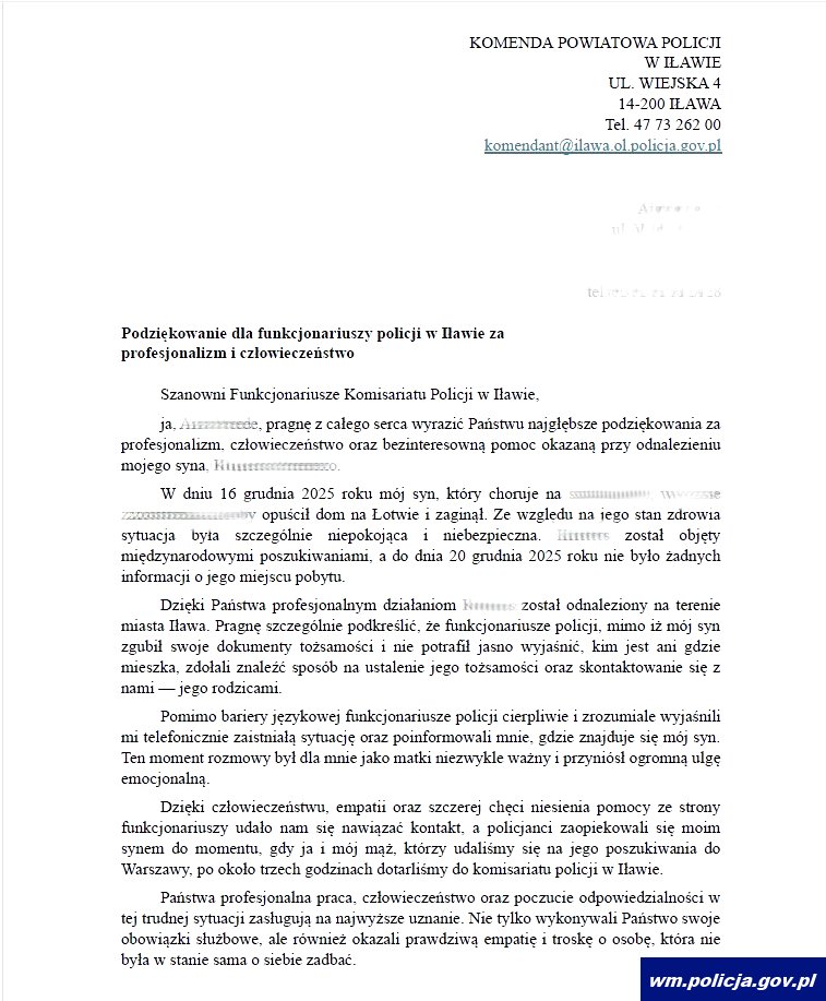 "Państwa postawa i działania znaczą dla mojej rodziny więcej, niż jestem w stanie wyrazić słowami [...]. Nie tylko wykonywali Państwo swoje obowiązki służbowe, ale również okazali prawdziwą empatię i troskę o osobę, która nie była w stanie sama o siebie zadbać" – te słowa wdzięczności to fragment listu od obywatelki Łotwy, jaki dotarł do iławskiej komendy policji tuż przed świętami.