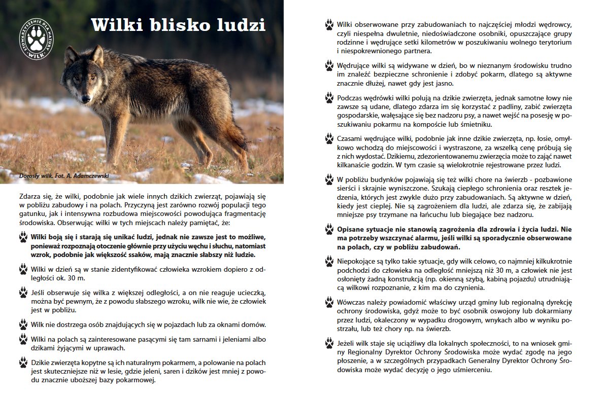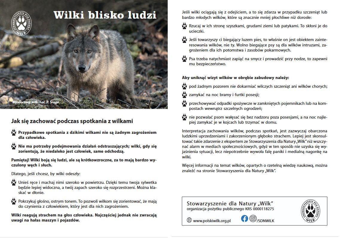 - W związku z pojawiającymi się sygnałami o zwiększonej aktywności wilków na terenie gminy zachęcamy do zapoznania się z ulotką informacyjną Stowarzyszenia dla Natury "Wilk" pt. "Wilki blisko ludzi" - czytamy w informacji opublikowanej przez urząd. - Publikacja ta zawiera rzetelne informacje na temat zachowania wilków, przyczyn ich pojawiania się w pobliżu zabudowań i zasad bezpieczeństwa oraz tego, jak reagować w przypadku spotkania z tymi zwierzętami.