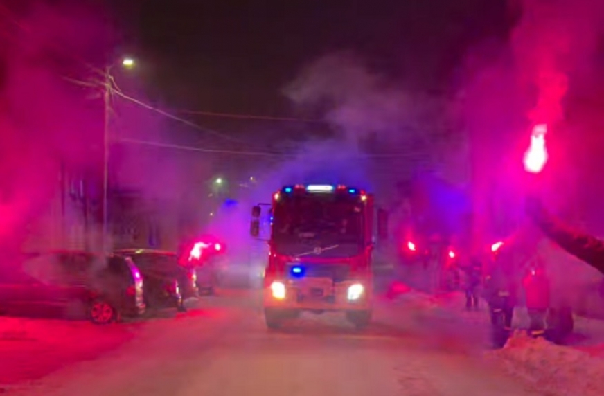 Załączamy zdjęcia i nagrania wideo – jest na co popatrzeć! Powitanie było głośne i widowiskowe - uruchomiono sygnały świetlne i dźwiękowe wozów, a zimowy krajobraz Zalewa rozświetliły flary.