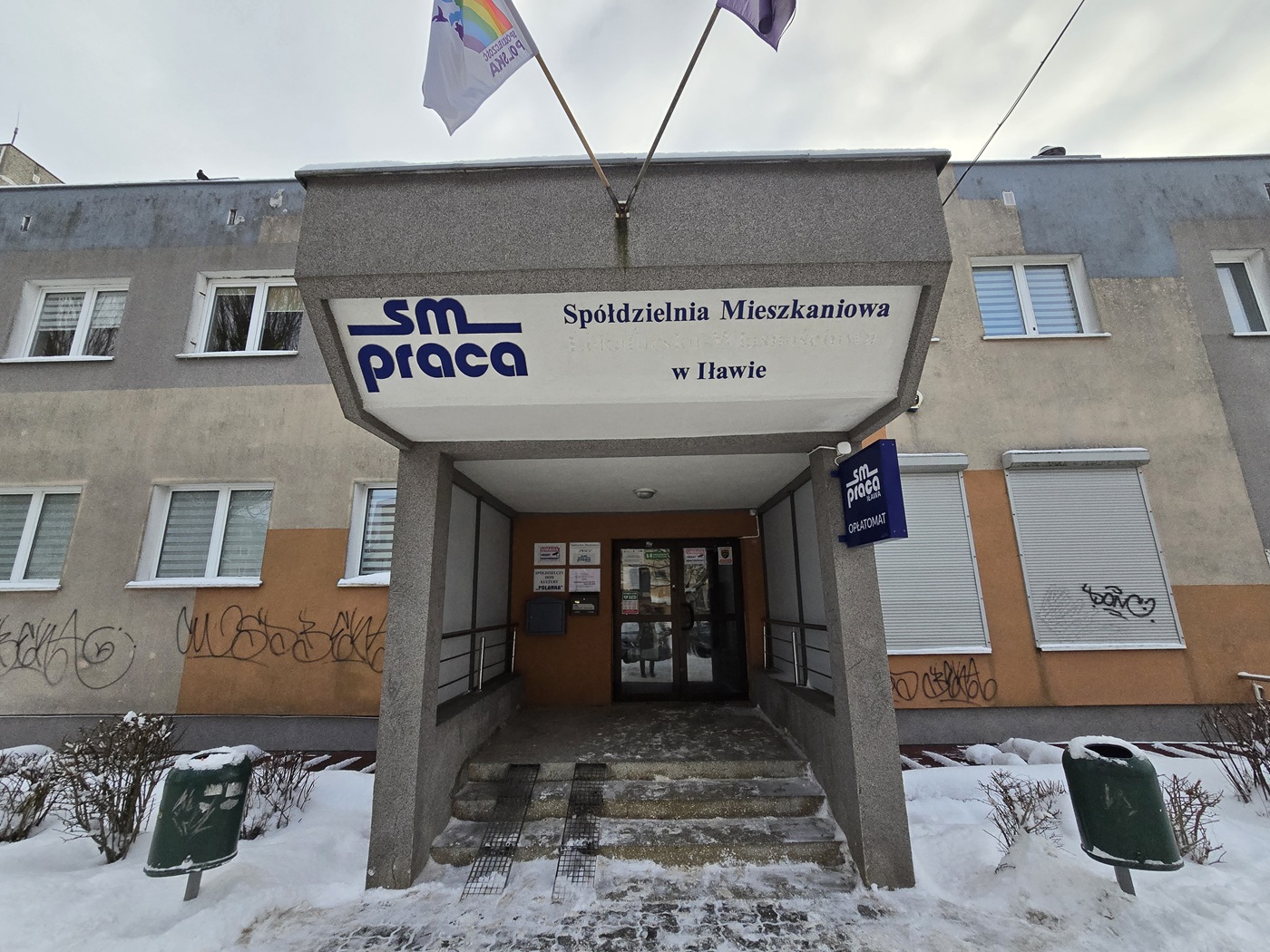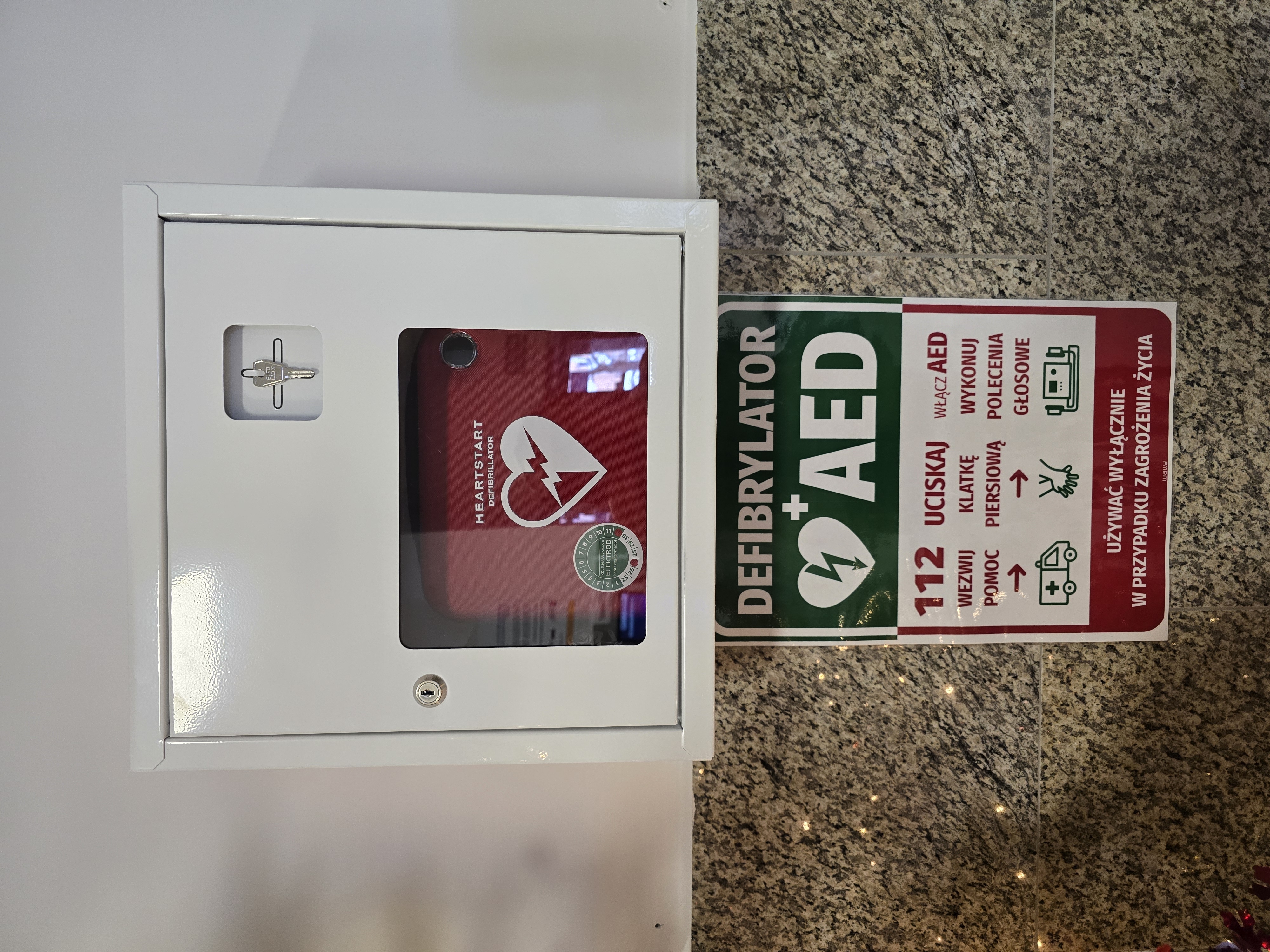 Na parterze na wprost drzwi wejściowych - tutaj znajduje się ogólnodostępny defibrylator AED Spółdzielni Mieszkaniowej "Praca" w Iławie.