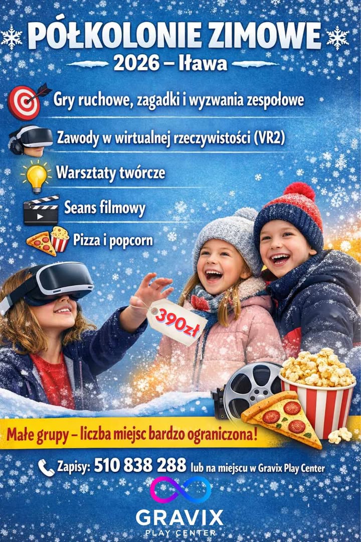 Małe grupy, przystępna cena, bogaty i różnorodny program atrakcji - zimowe półkolonie z Gravix Play Center Iława.