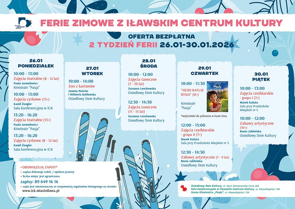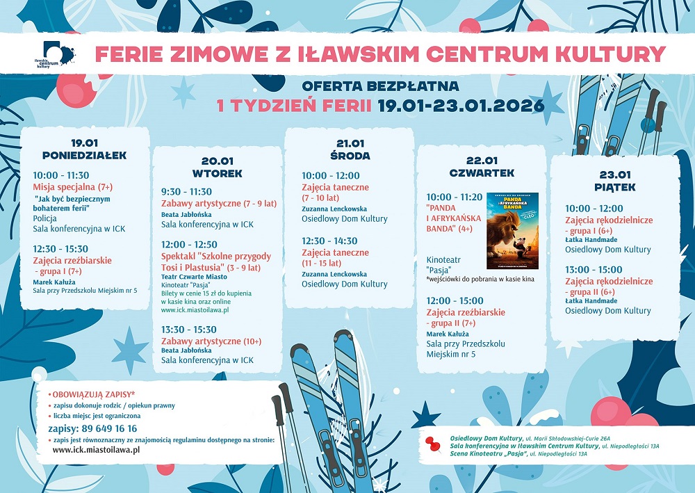 Poznaliśmy program ferii 2026 z Iławskim Centrum Kultury. Sprawdzamy, co zespół ICK przygotował dla najmłodszych mieszkańców na okres dwutygodniowej zimowej przerwy od szkolnych obowiązków.