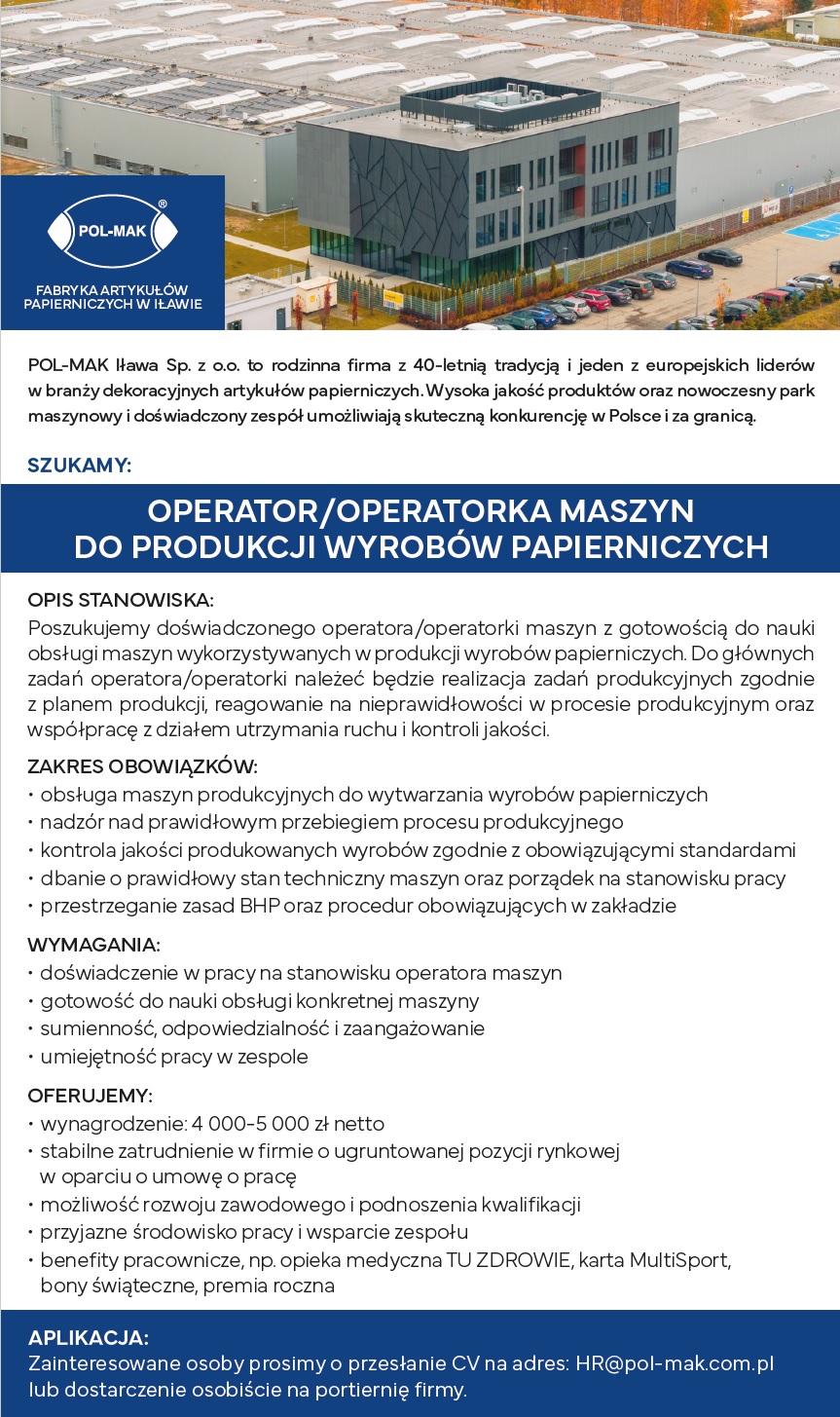 Zainteresowane osoby prosimy o przesłanie CV na adres: HR@pol-mak.com.pl lub dostarczenie osobiście na portiernię firmy.
