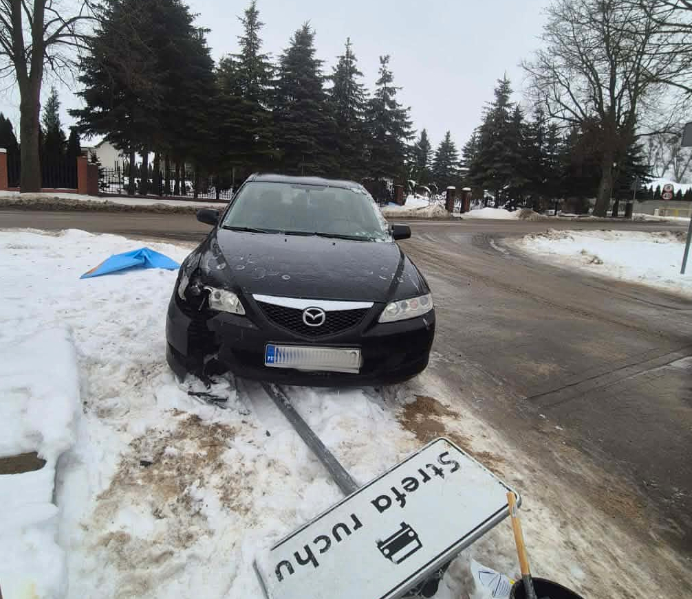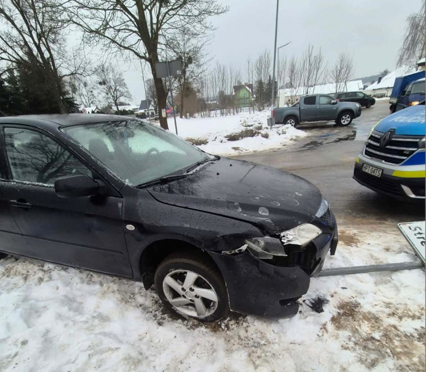 Natomiast 22-latek kierujący mazdą nie dostosował prędkości do panujących warunków drogowych i skręcając, uderzył w znak drogowy.