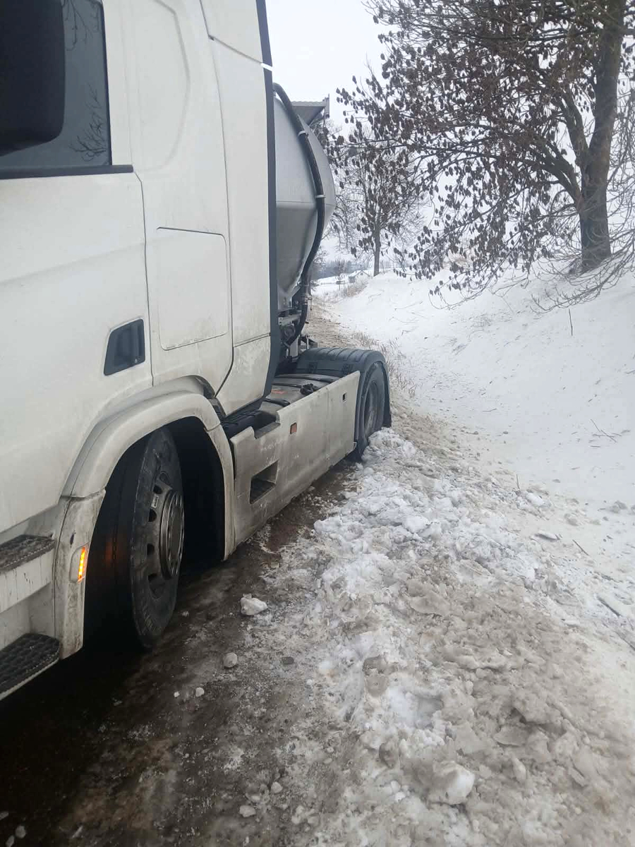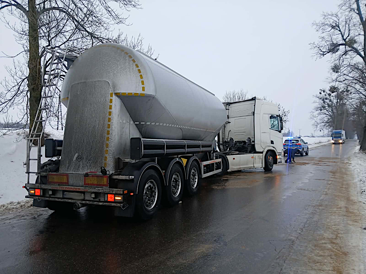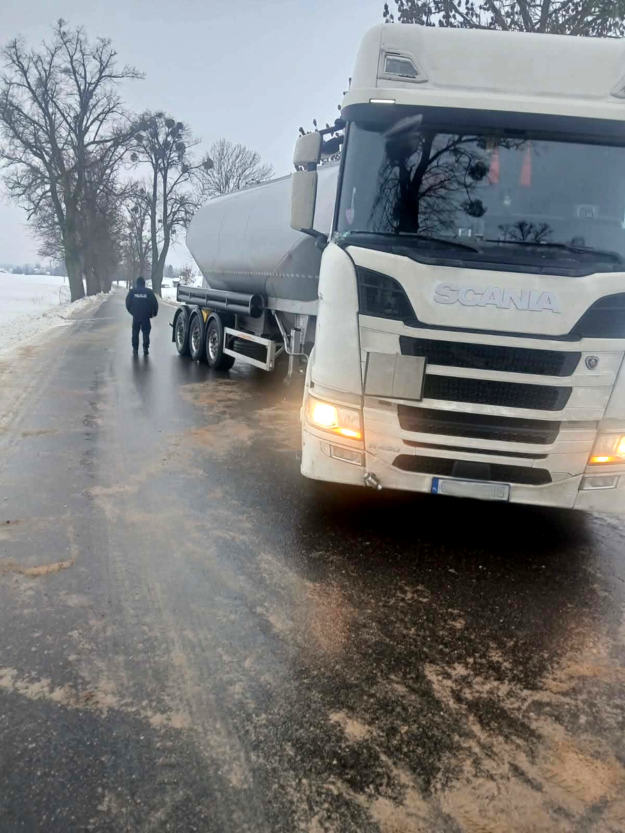 Do pierwszego zdarzenia doszło już kilka minut po godzinie 8:00. Zgłaszający oświadczył, że w miejscowości Łęgowo w gminie Kisielice ciężarówka z powodu śliskiej nawierzchni wjechała do rowu i częściowo zablokowała pas ruchu. Na szczęście nikomu nic poważnego się nie stało, a na miejsce przyjechała piaskarka. Dzięki pomocy będących na miejscu osób oraz funkcjonariuszy pojazd ciężarowy odjechał.