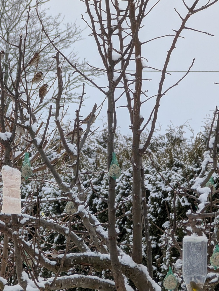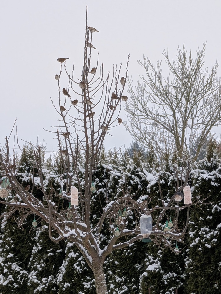 W tych dniach "ptasia stołówka" w Rudzienicach działa pełną parą. Tylko podczas naszej wizyty ptaki, które początkowo czekają na pobliskich drzewach i krzewach, stopniowo ośmielają się, zbliżają i następnie dziesiątkami korzystają z przygotowanego dla nich na drzewkach w ogrodzie poczęstunku. To głównie wróblowate, ale nie tylko wróble. Niektóre mają barwne elementy upierzenia, które nie tylko cieszą oko, ale też pozwalają zidentyfikować gatunek. Poza wróblami regularnie przylatują też kosy i sójki, widywano tu również dzwońce o ładnym ubarwieniu, a także grubodzioby – o charakterystycznych grubych dziobach – i jeszcze wiele innych.