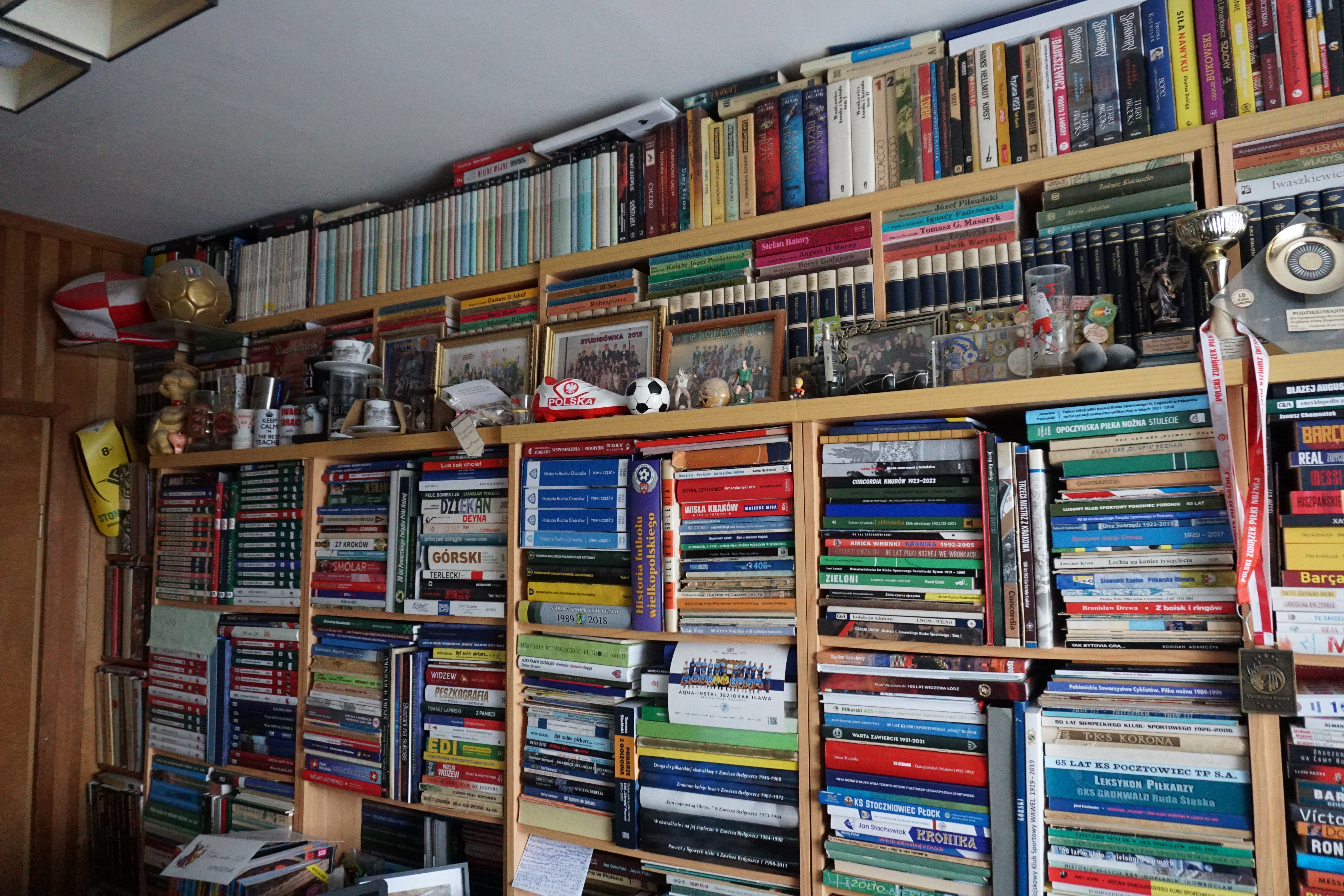 O Piotrze Kasperowiczu i jego niezwykłej pasji pisałem już w 2019 roku, z tej publikacji pochodzą niektóre jego wypowiedzi zamieszczone w tym artykule. Aby zaktualizować dane spotykamy się dosłownie w tym samym pokoju, będącym jednocześnie pracownią kronikarza Jezioraka Iława. Patrzę po półkach – książek jeszcze więcej niż było wówczas, pamiątek sportowych także. Między innymi są to koszulki piłkarzy ręcznych Jezioraka Iława – o nich także było w poprzednich kronikach, gdy jeszcze sekcja szczypiorniaka nie założyła własnego klubu.