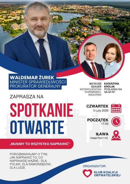 Klub Koalicji Obywatelskiej zaprasza mieszkańców Iławy i regionu na otwarte spotkanie z ministrem sprawiedliwości i prokuratorem generalnym Waldemarem Żurkiem. Wydarzenie odbędzie się w czwartek, 5 lutego 2026 roku, a jego początek zaplanowano na godzinę 17:00. Miejscem spotkania będzie Hotel Port 110 w Iławie.