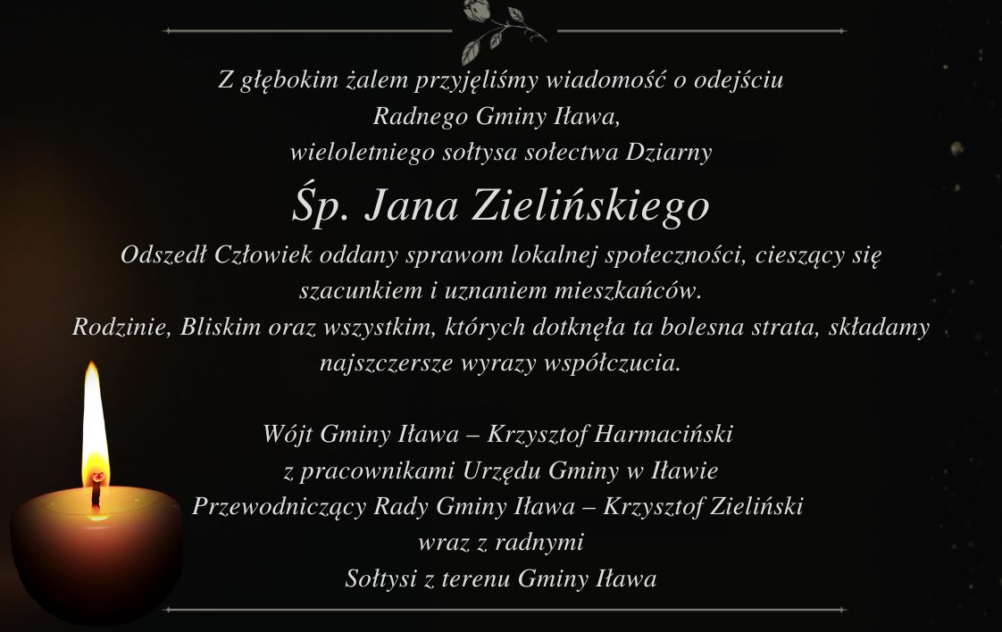"Odszedł Człowiek oddany sprawom lokalnej społeczności, cieszący się szacunkiem i uznaniem mieszkańców. Rodzinie, Bliskim oraz wszystkim, których dotknęła ta bolesna strata, składamy najszczersze wyrazy współczucia" – przedstawiciele Gminy Iława na czele z Wójtem Gminy Iława Krzysztofem Harmacińskim wraz z pracownikami Urzędu Gminy w Iławie, Przewodniczący Rady Gminy Iława Krzysztof Zieliński wraz z radnymi oraz sołtysi z terenu Gminy Iława z głębokim żalem przyjęli wiadomość o śmierci śp. Jana Zielińskiego. Był radnym Rady Gminy Iława aktualnej kadencji i wieloletnim sołtysem sołectwa Dziarny.