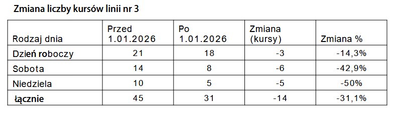„Informujemy, że od dnia 01.01.2026 r. zostaną wprowadzone zmiany w rozkładzie linii nr 3”.