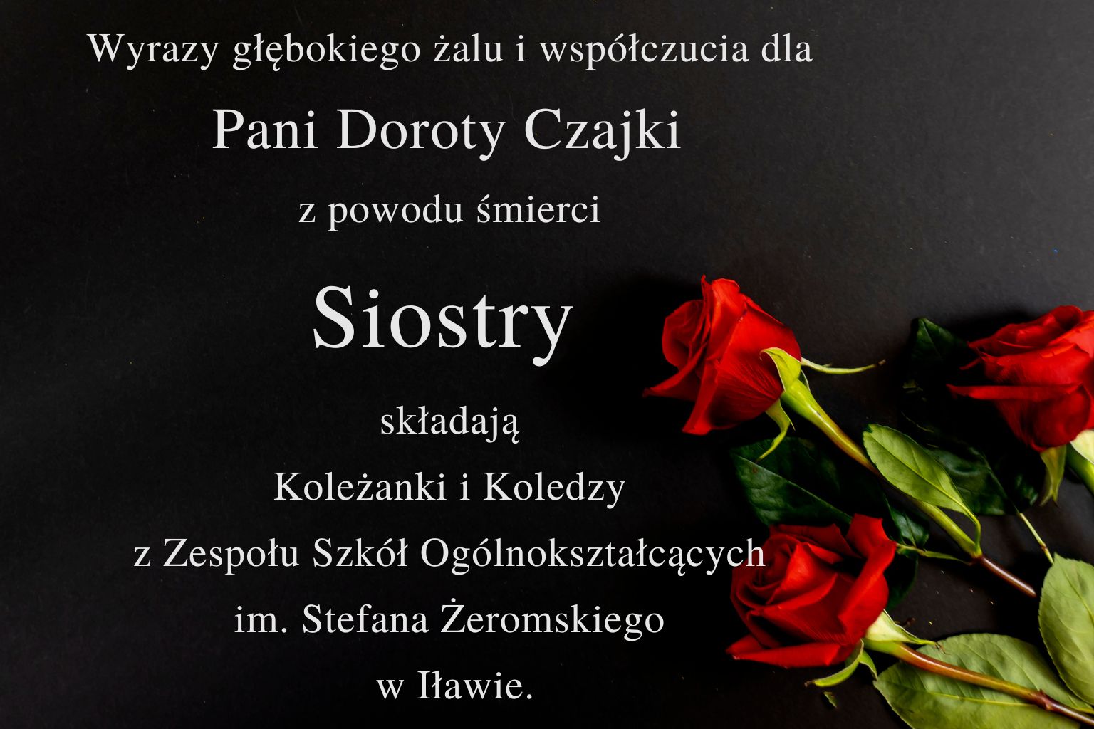 Wyrazy głębokiego żalu i współczucia dla Pani Doroty Czajki z powodu śmierci Siostry składają Koleżanki i Koledzy z Zespołu Szkół Ogólnokształcących im. Stefana Żeromskiego w Iławie.