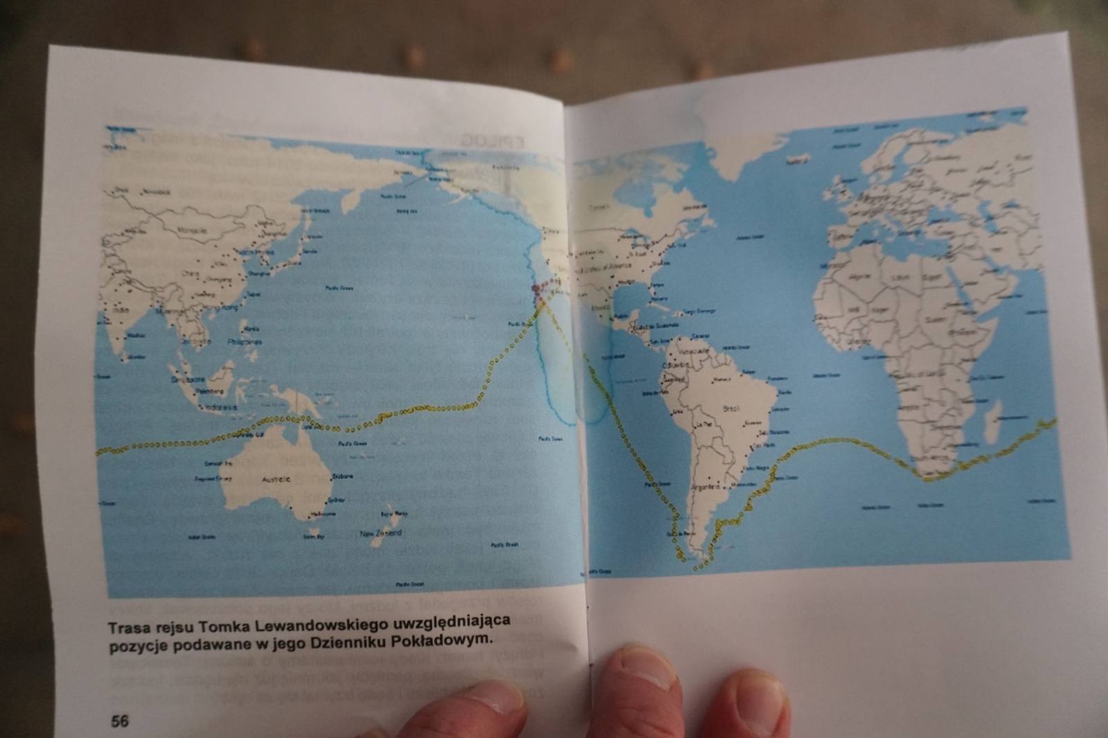 Mapa, pochodząca ze strony zeglarz.net, pokazująca trasę, którą płynął Tomasz Lewandowski. Można ją także zobaczyć m.in. w książce "Mama ocean" autorstwa Andrzeja Kowalczyka,